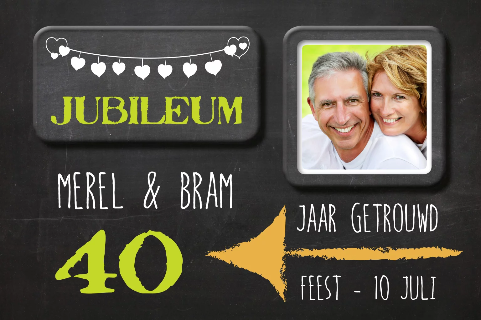 Dat wordt feesten, 40 jaar getrouwd! Maak deze bijzondere uitnodiging persoonlijk met jullie leukste foto. Pas alle kleuren van de tekst en afbeeldingen aan voor een mooi geheel.