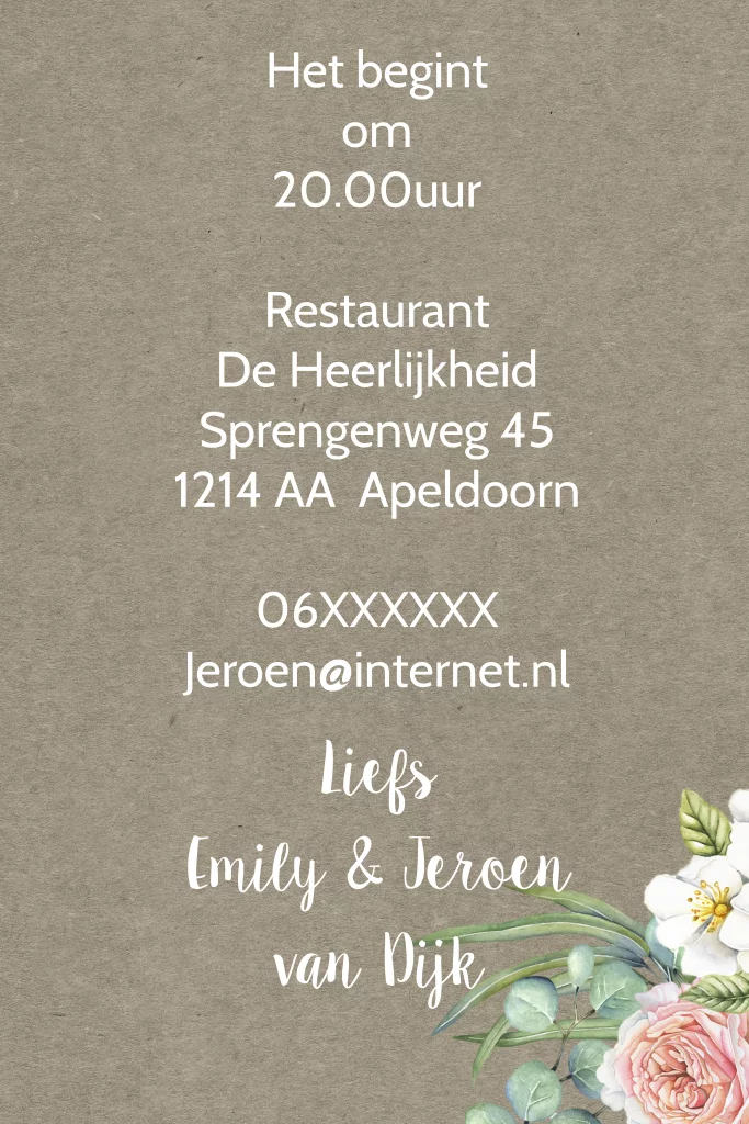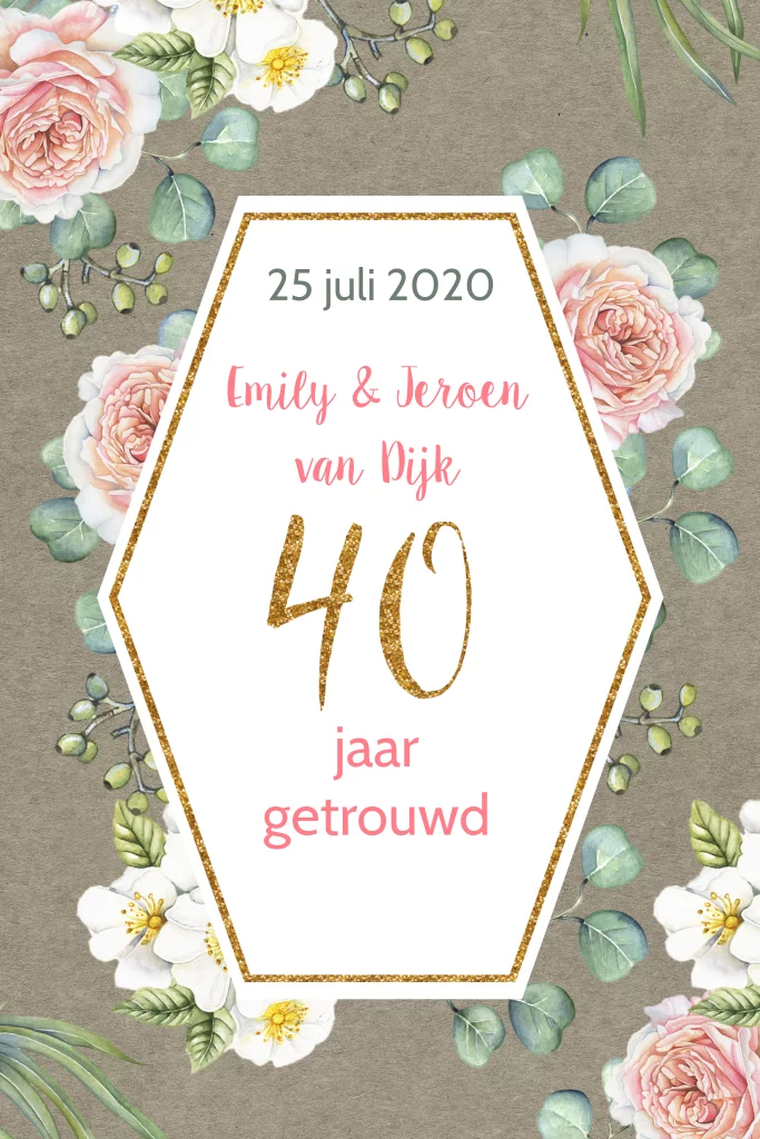 Uitnodiging voor veertig jaar getrouwd met rozen en eucalyptus in aquarel op kraftpapier achtergrond. Mooi ook de glitter 40 van goud in het midden. Maak het af met een bijpassende kleur envelop!