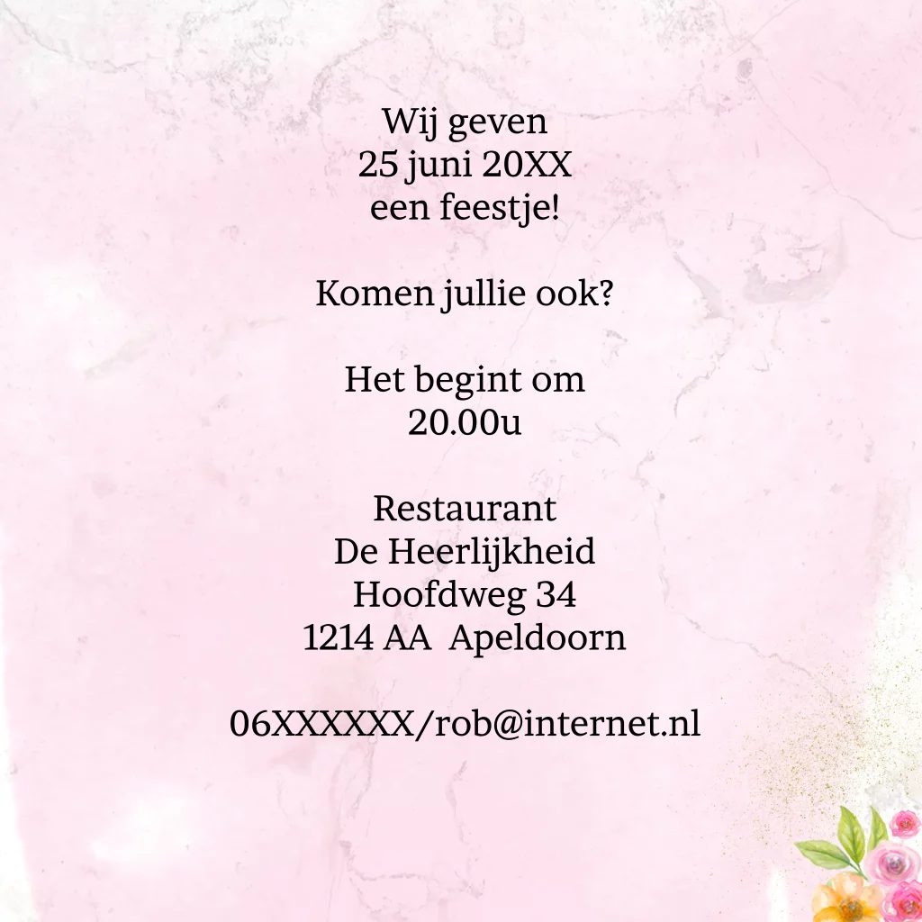 Uitnodiging voor een 40 jarig huwelijksjubileum met champagnefles versierd met bloemen in aquarel en hartjes en twee glazen en veel veel goudglitter. Mooi met een gouden envelop.