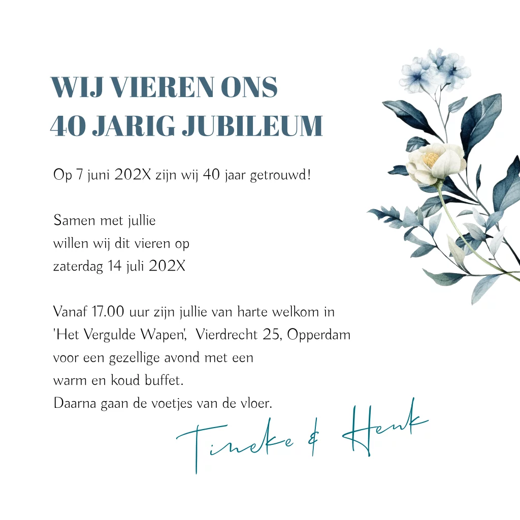 Vier 40 jaar samenzijn met deze prachtige jubileumuitnodiging Romantic Botanic Blue. Voeg eenvoudig een persoonlijke touch toe met jullie eigen foto's.