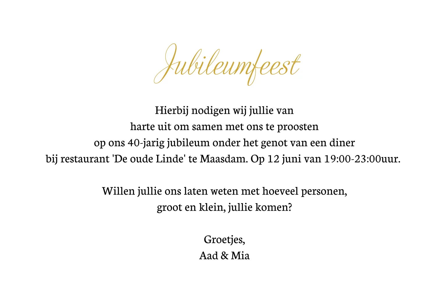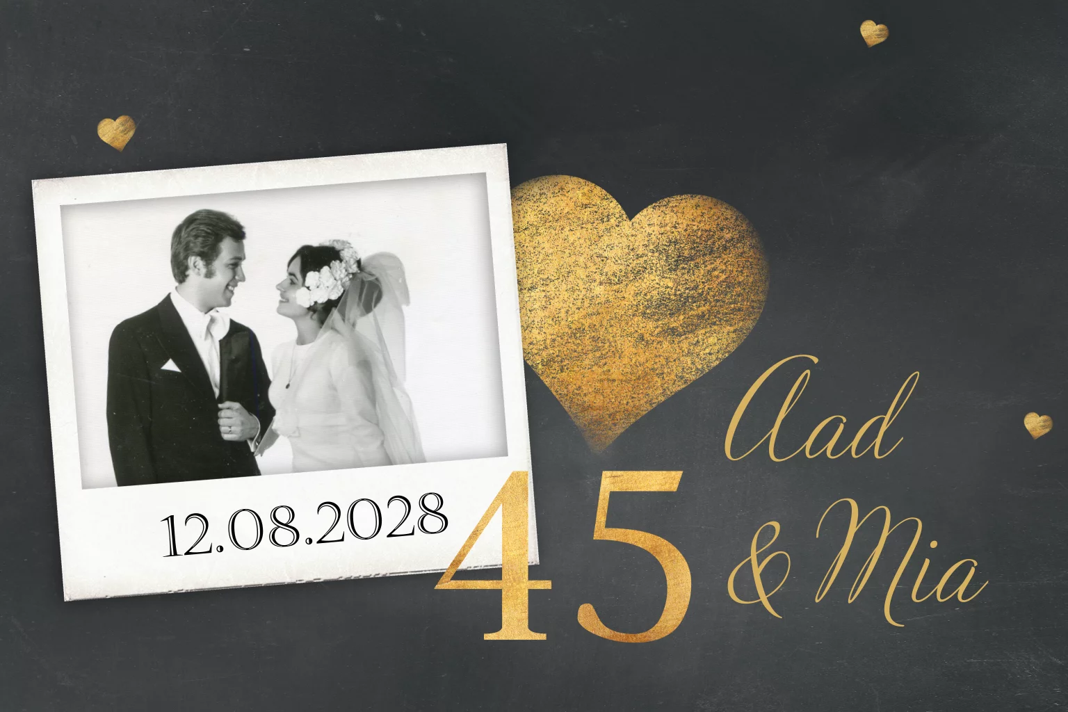Uitnodiging die perfect past bij een 45 jarig huwelijksfeest. Door de krijtbord achtergrond komen de gouden hartjes mooi naar voren. Mooi met de persoonlijke foto op de binnenkant van de kaart. Gaaf met een gouden envelop.