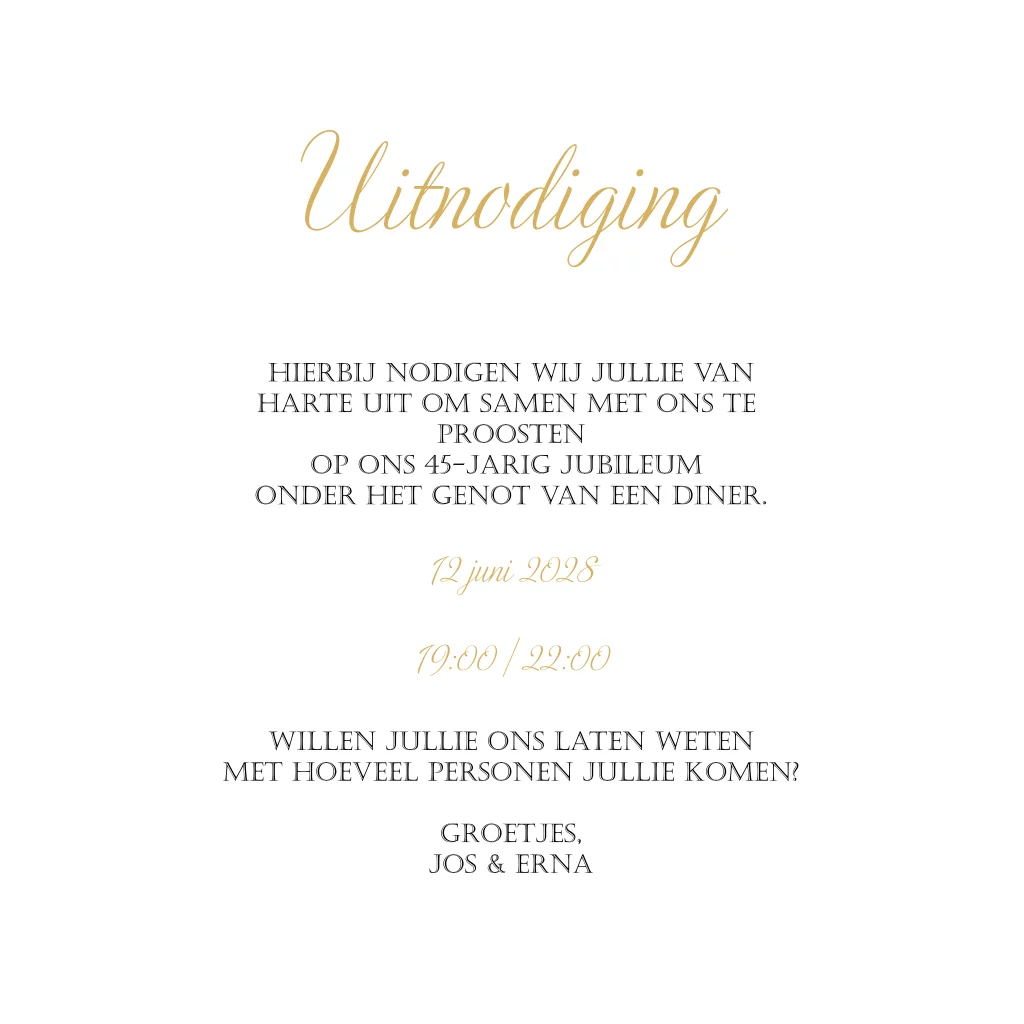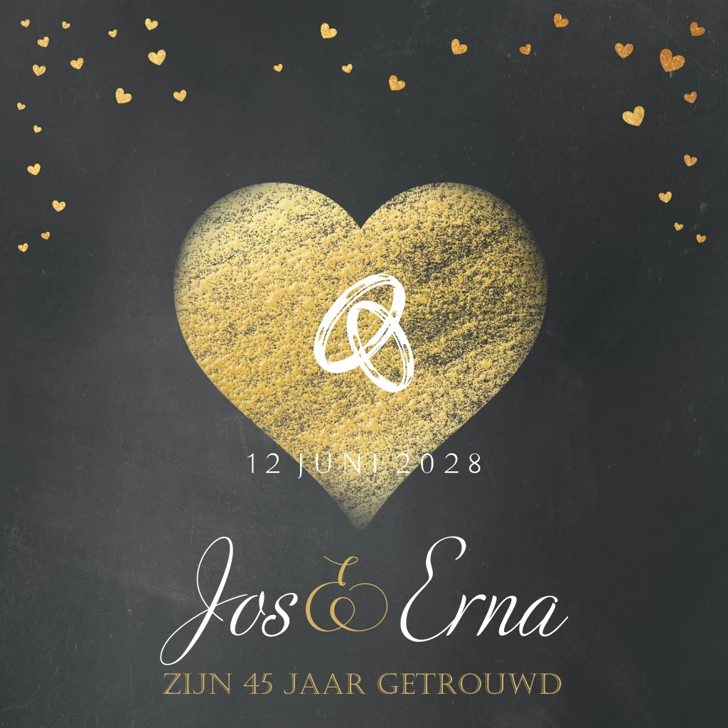 Romantische uitnodiging voor een 45 jarig huwelijksfeest. Door de krijtbord achtergrond komen de gouden hartjes mooi naar voren. Aan de binnenkant is er ruimte voor een persoonlijke foto. Gaaf met een gouden envelop.