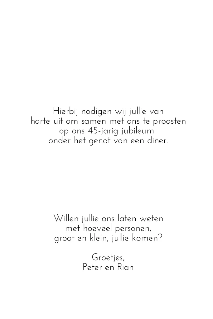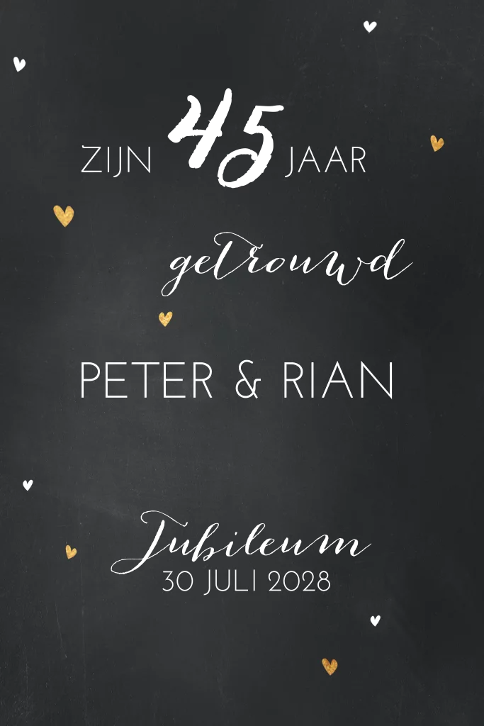 Romantische uitnodiging voor een 45 jarig huwelijksfeest. Door de krijtbord achtergrond komen de gouden hartjes mooi naar voren. Heel erg gaaf met een bijpassende gouden envelop.