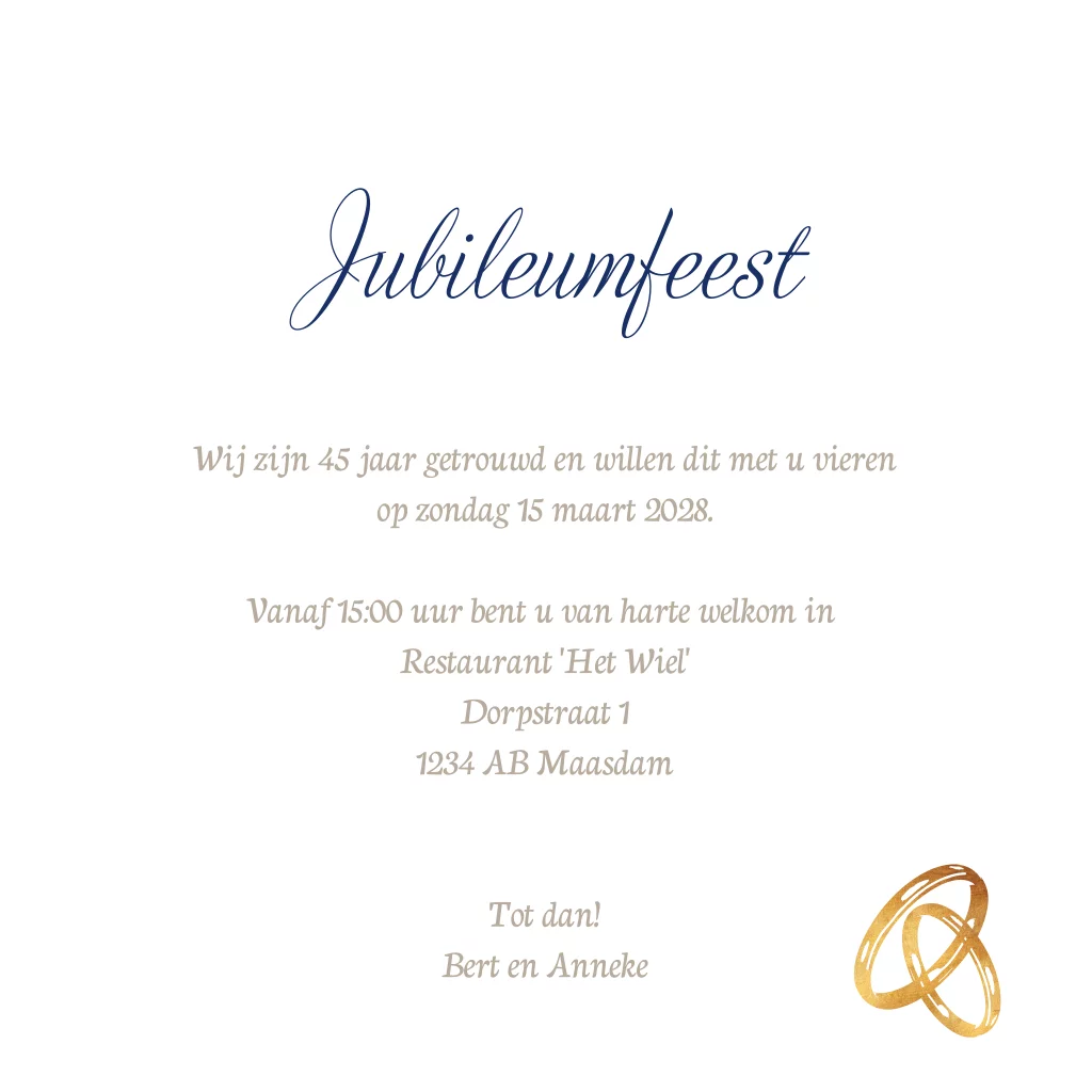 Ontwerp zelf een prachtige uitnodiging voor jullie 45-jarig jubileum! Voeg een vleugje elegantie toe met sierlijke gouden hartjes en donkerblauwe letters. Deze romantische uitnodiging is perfect te combineren met zowel gouden als donkerblauwe enveloppen. Creëer een onvergetelijke aankondiging die de bijzondere mijlpaal van 45 jaar liefde op een stijlvolle manier weerspiegelt.