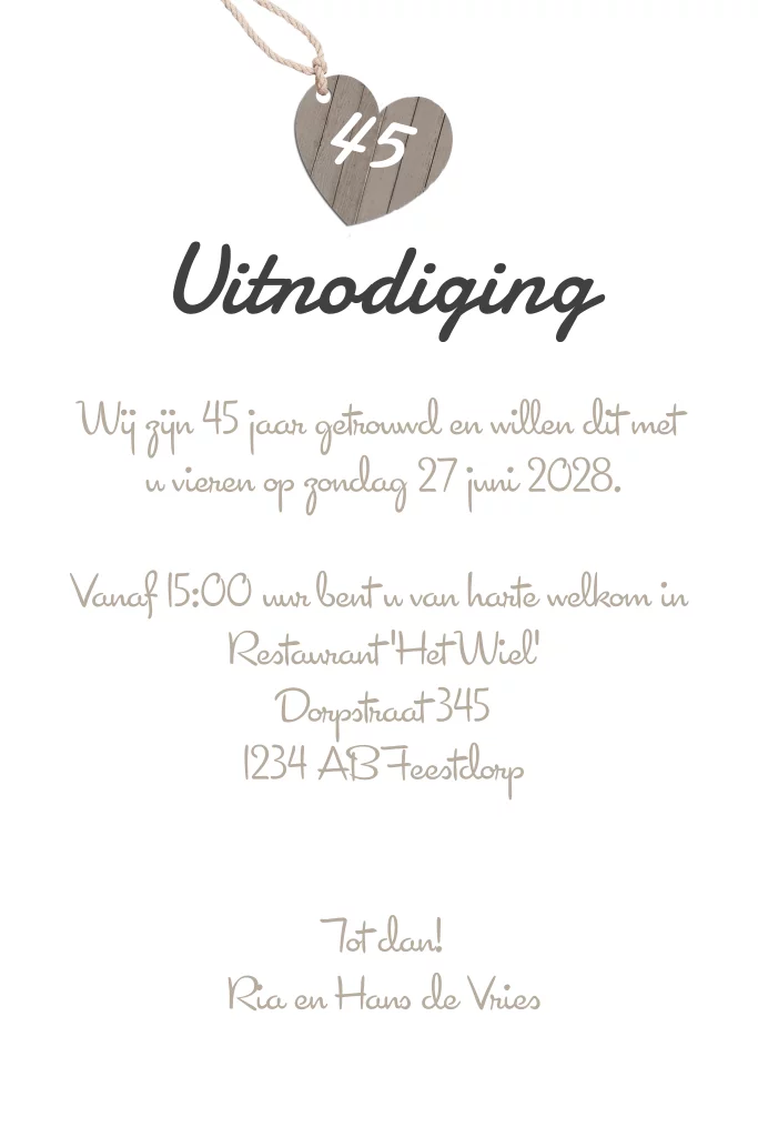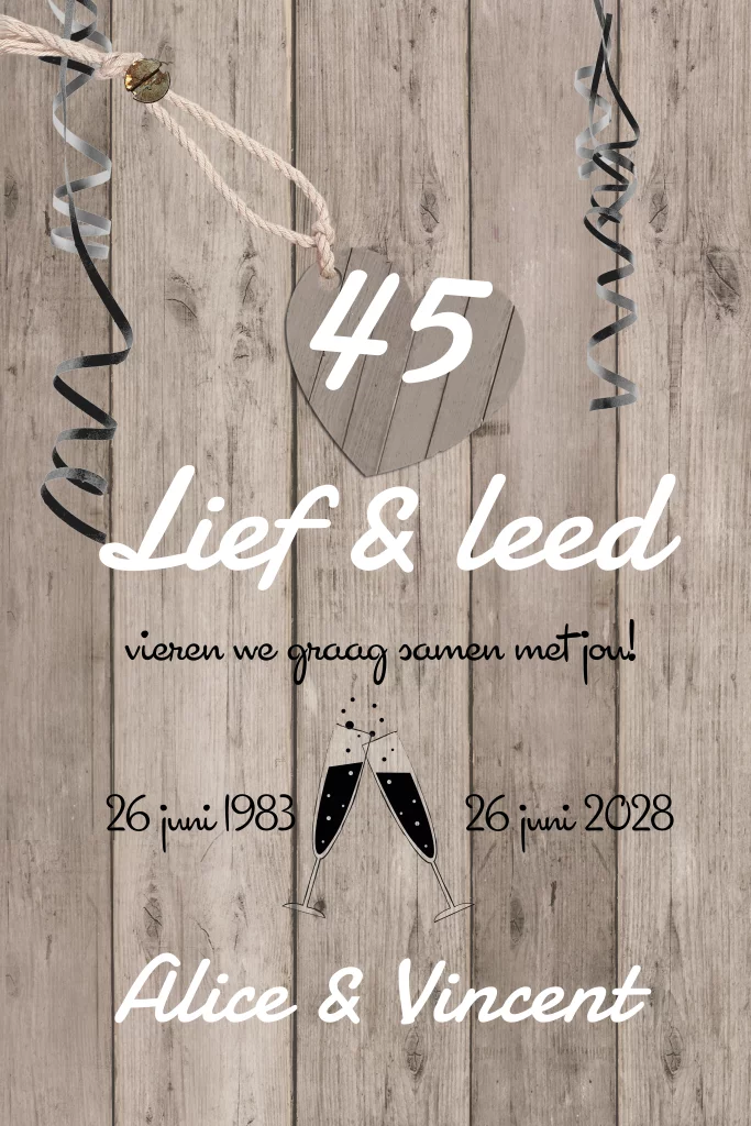 45 jaar getrouwd uitnodiging met hout, foto en ringen