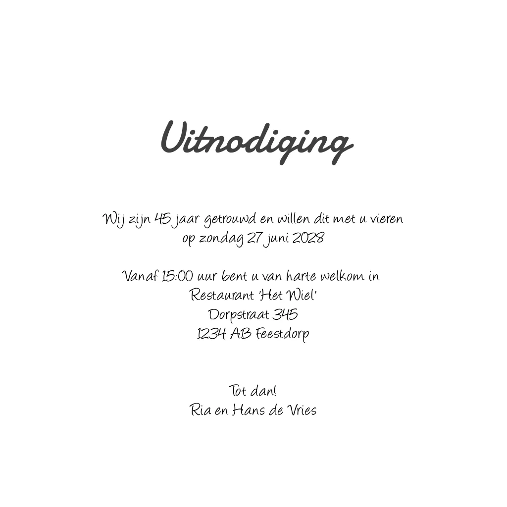 Uitnodiging 45 jaar getrouwd met hout, hartje en foto