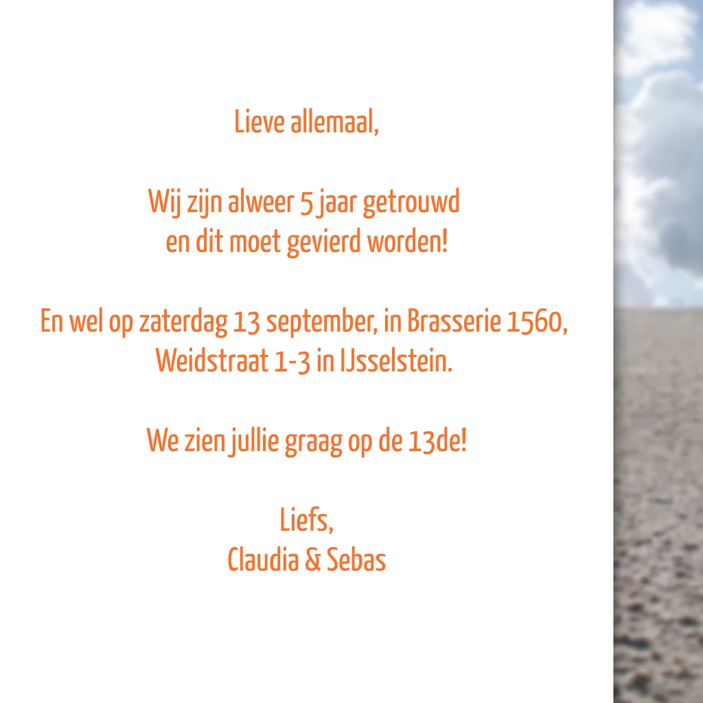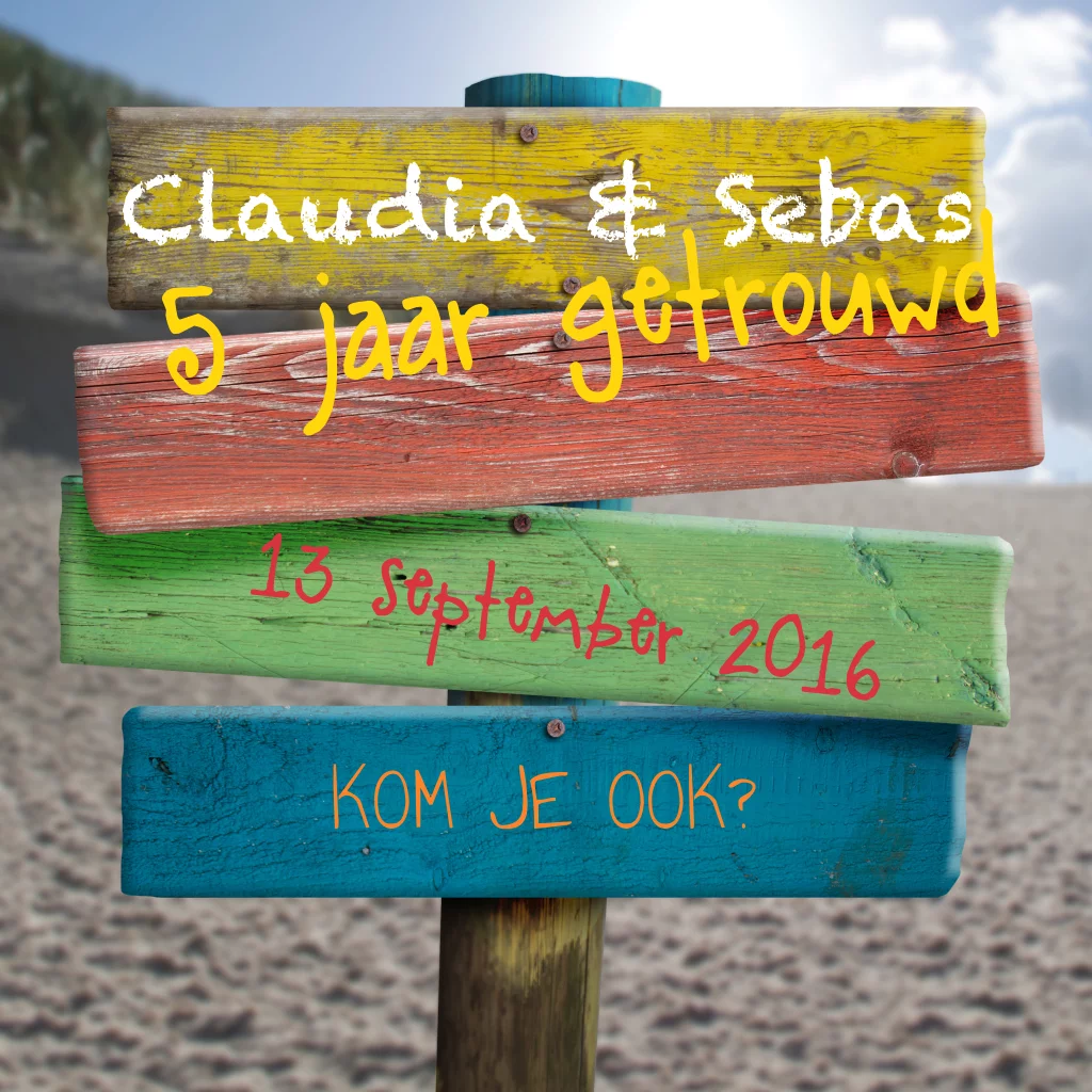 Vrolijke jubileumkaart voor 5-jarig huwelijk met wegwijzer en strand. Pas de tekst aan de binnenkant aan om jullie unieke kaart te maken.