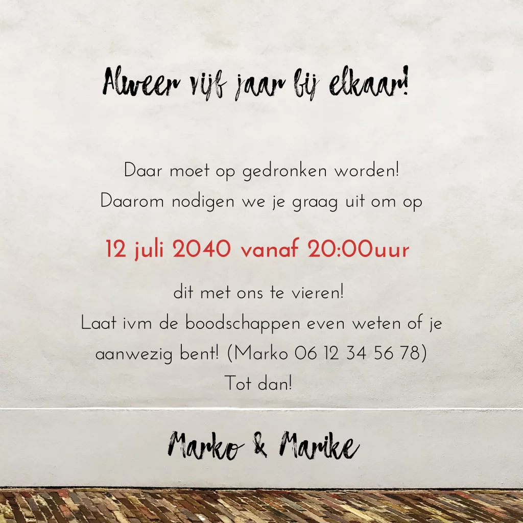 5 jaar bij elkaar en het huwelijksbootje drijft nog! Dat moet gevierd worden! Stuur al je favo mensen deze kaart om te laten weten wanneer jullie dit vieren!
