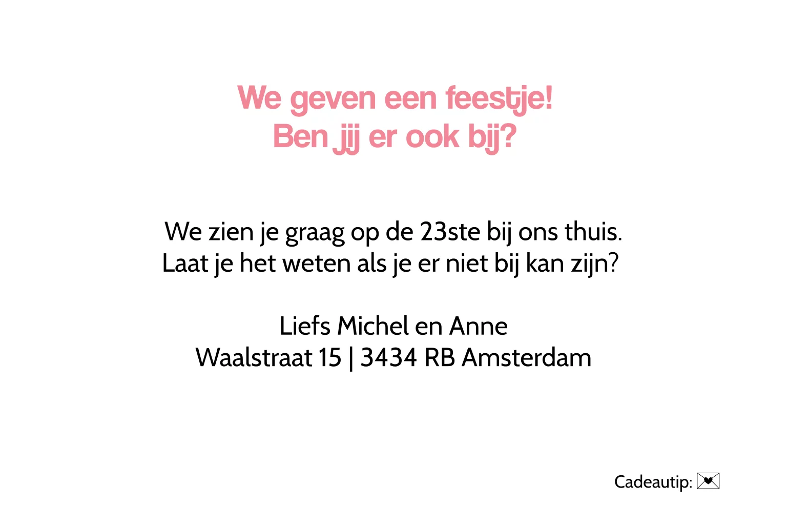 Feestelijke maar strakke uitnodiging met kraft achtergrond en vrolijke blauw, roze en groene strepen. Jullie houten huwelijk is een feestje waard. Leuk om deze kaart te combineren met een kraft envelop.