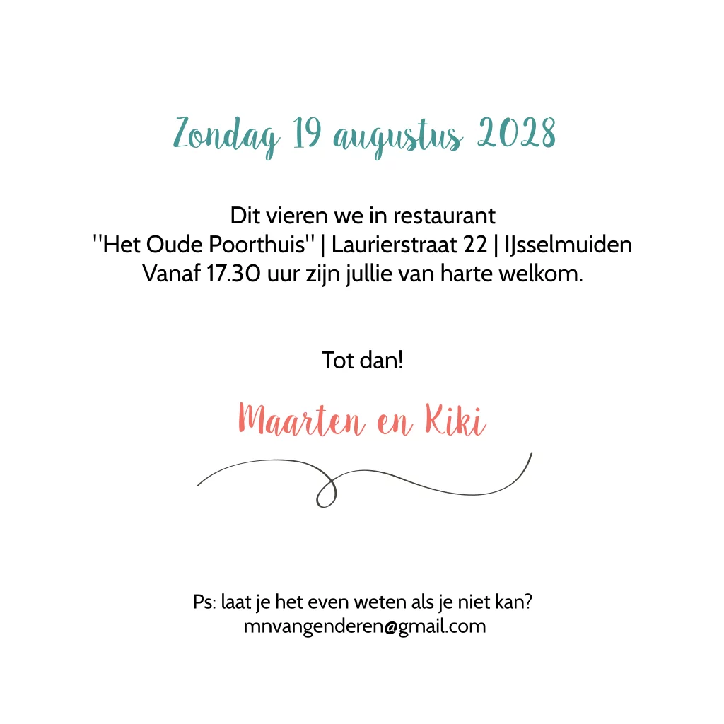 Strakke maar feestelijke uitnodiging met kraft achtergrond en vrolijke gekleurde strepen. Jullie houten huwelijk is een feestje waard. Gaaf om deze kaart te combineren met een kraft envelop.