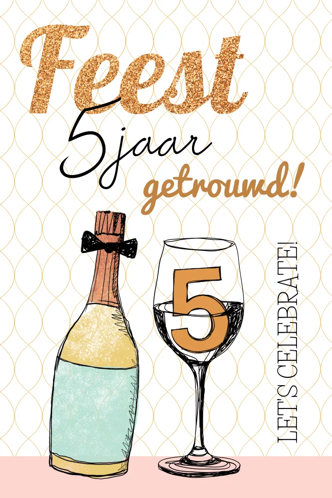Een vrolijke kaart met geïllustreerde champagne en glas voor jullie 5-jarige huwelijksfeest.