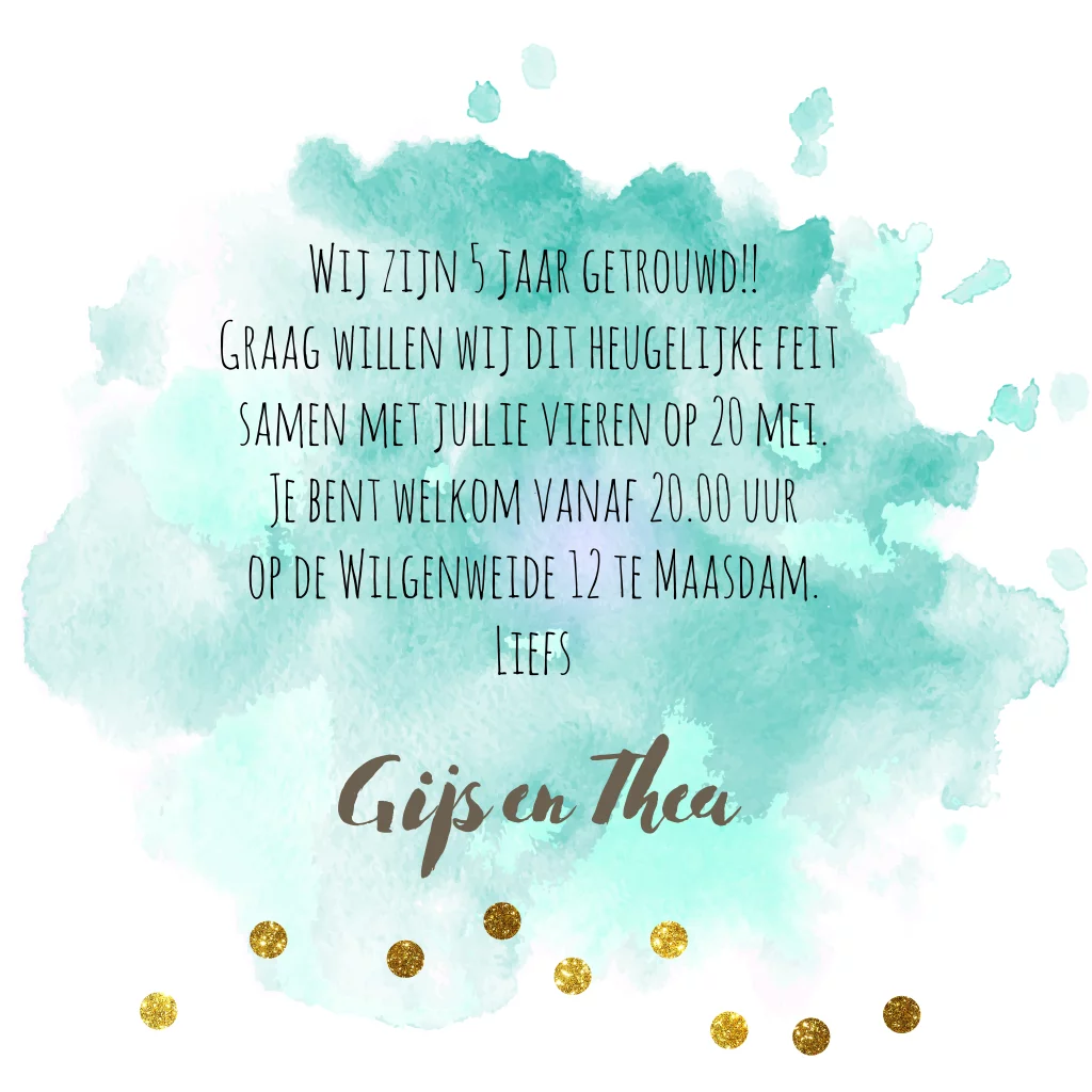 Hippe huwelijkjubileum kaart voor jullie 5 jarig huwelijks jubileum. Leuk met aquarel elementen en gouden confetti.