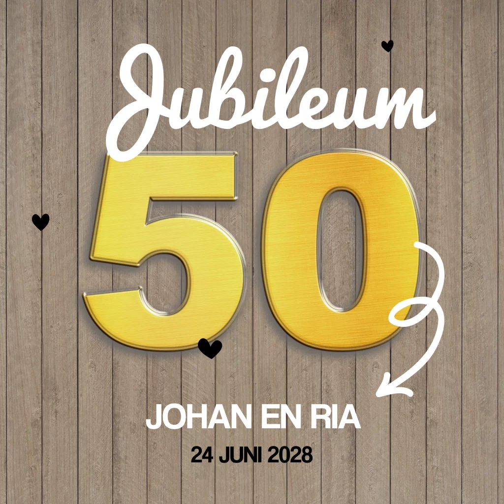 Uitnodiging voor een vijftig jarig huwelijksjubileum. Deze kaart heeft een hout print met een grote gouden 50 in het midden. Mooi afgewerkt met witte getekende hartjes.