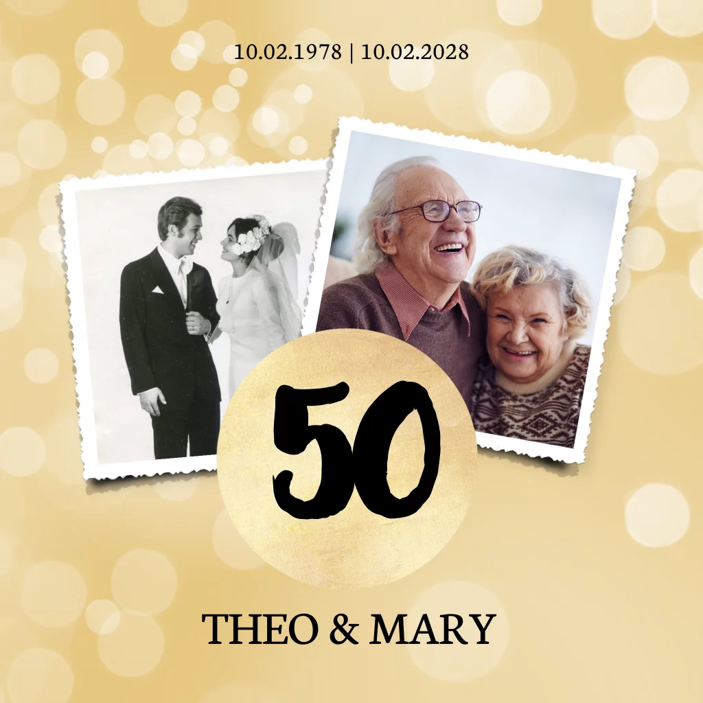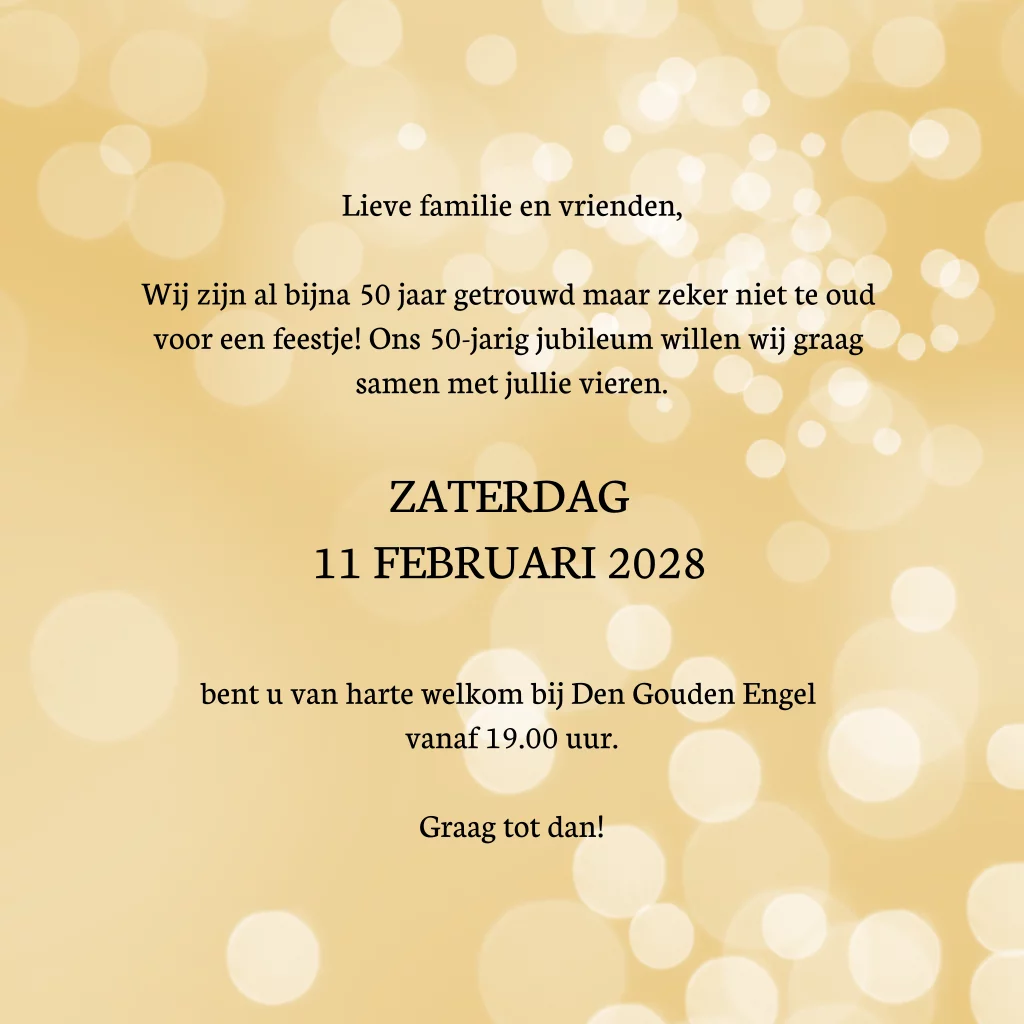Feestelijke uitnodiging voor jullie vijftig jarig huwelijk met zacht gouden kleuren en bollen. Op de voorkant van de kaart is er ruimte voor persoonlijke foto's!