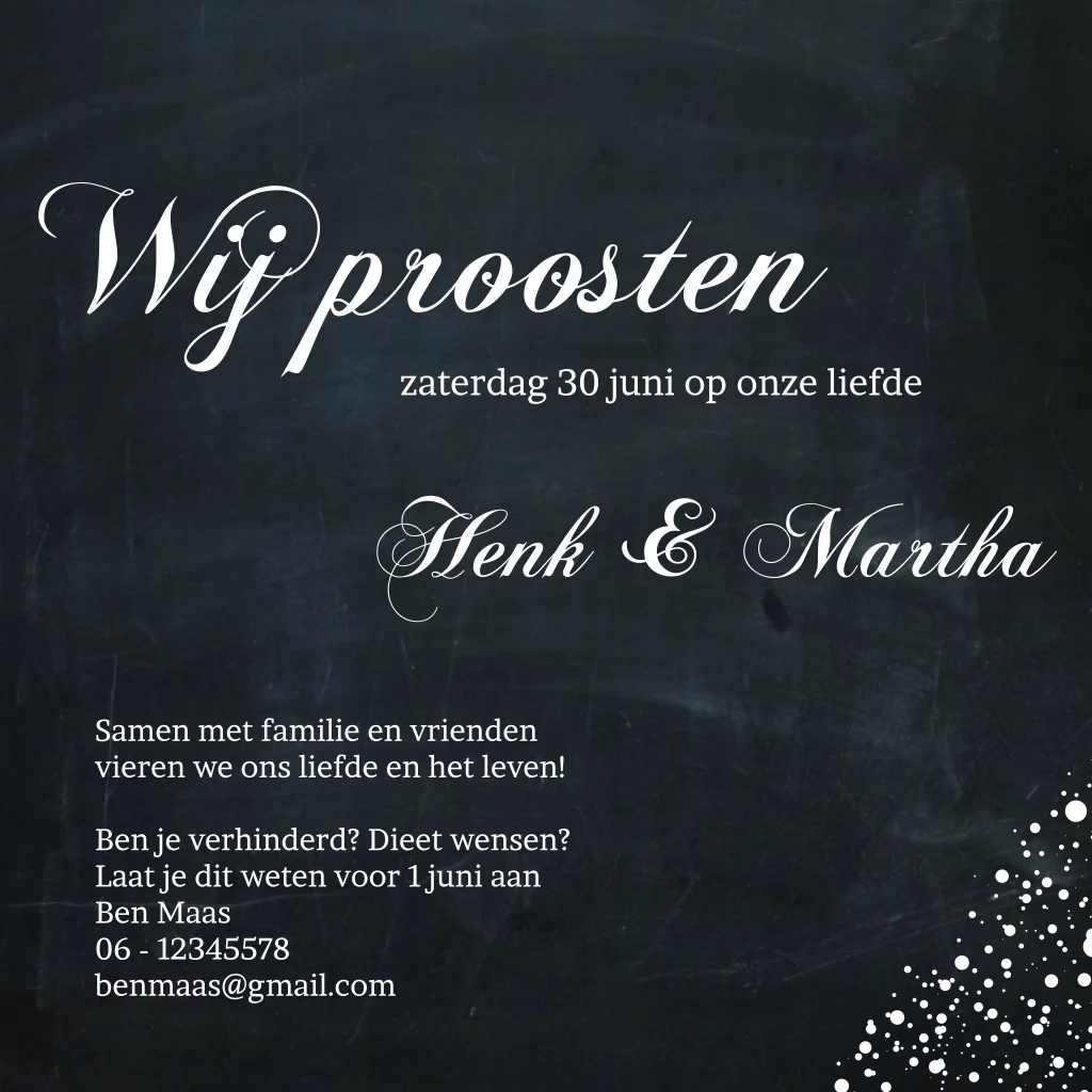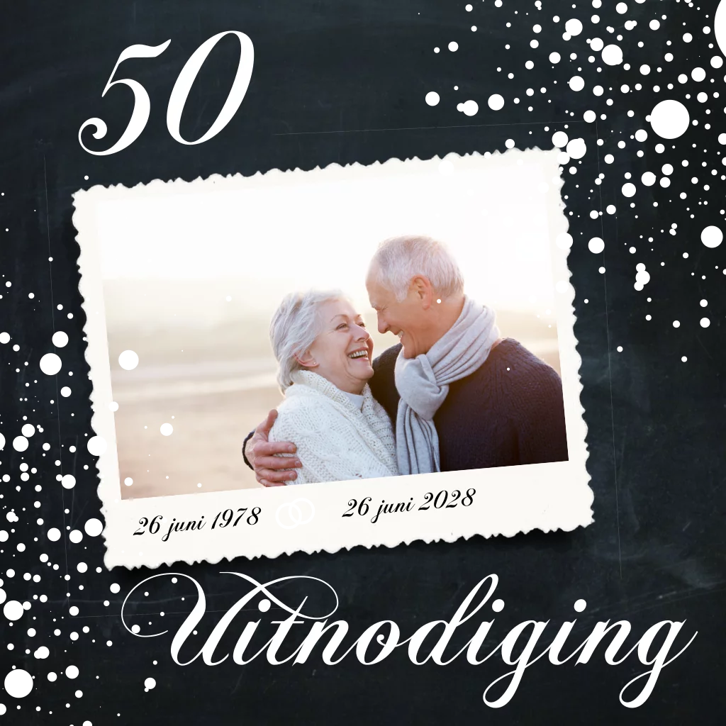 Vrolijke en feestelijk kaart voor jullie 50 jarig huwelijksfeest. Vrolijk door de gouden confetti en persoonlijk door de foto. Maak het af door te kiezen voor een gouden envelop.