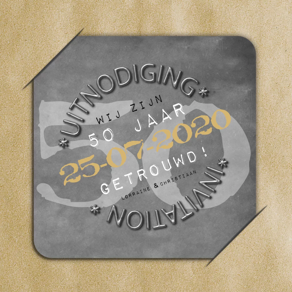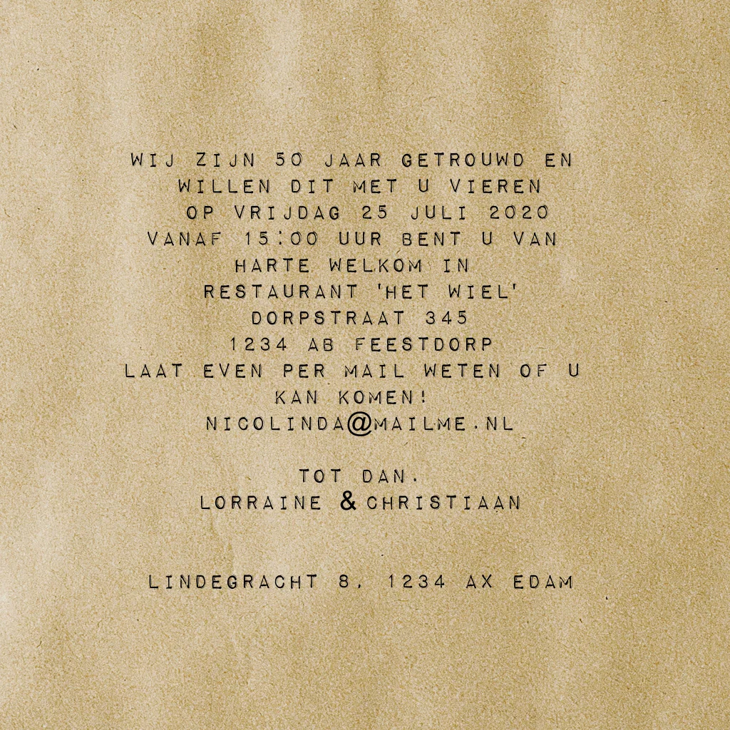 Hippe jubileumkaart met een metalen plaat die vast zit in het papier. Op de plaat kan je de teksten aanpassen. Zet aan de binnenkant jullie mooiste foto.