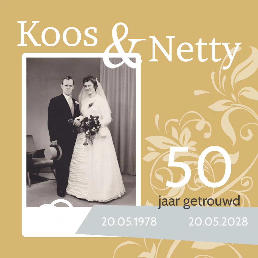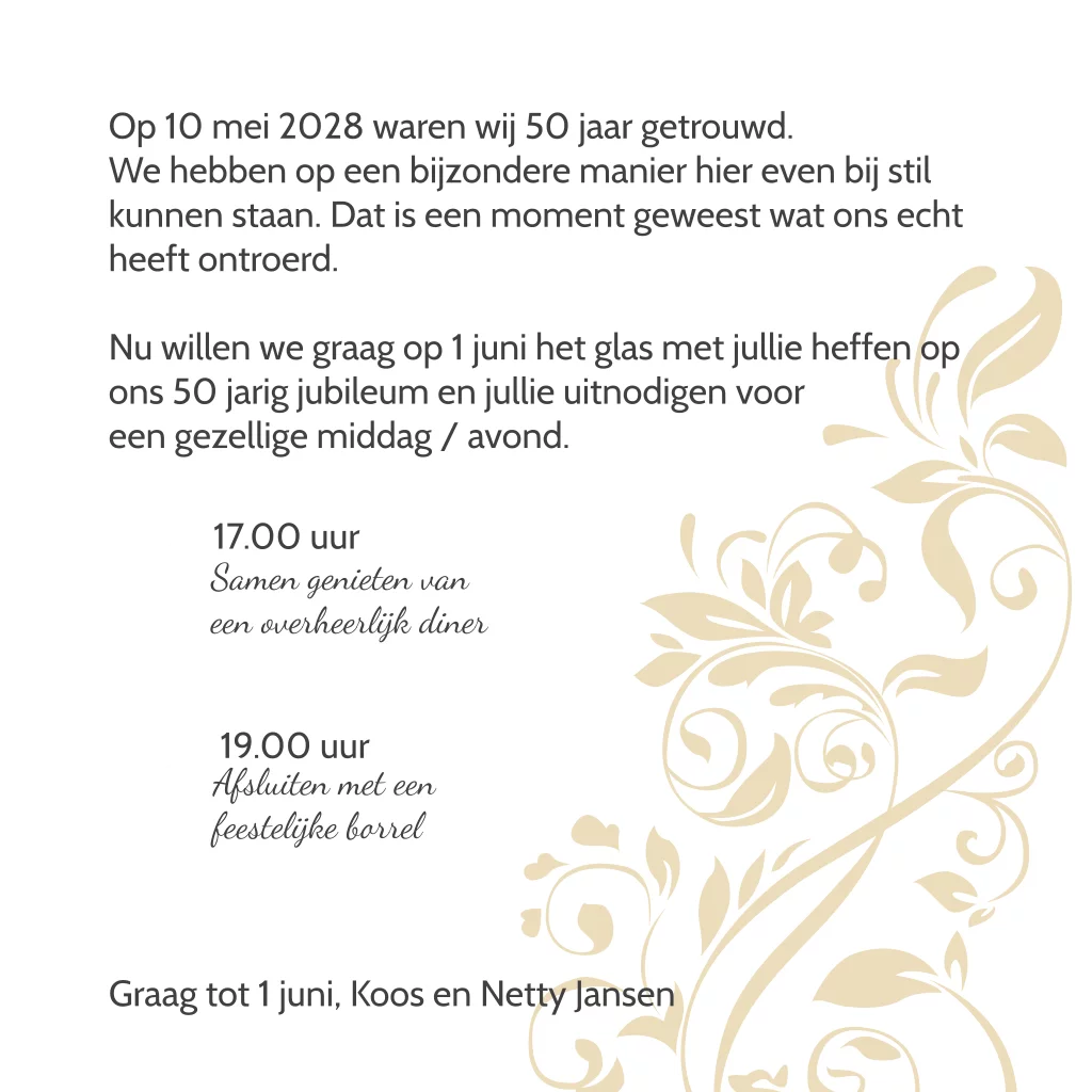Deze sierlijke kaart kan verstuurd worden als uitnodiging voor een 50 jarig huwelijksjubileum. De foto geeft de kaart een extra persoonlijke tint!