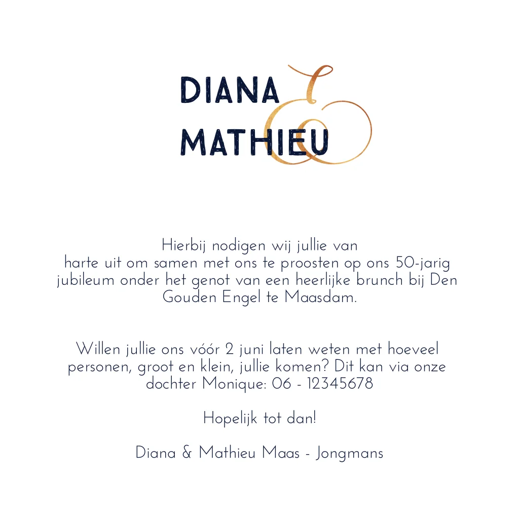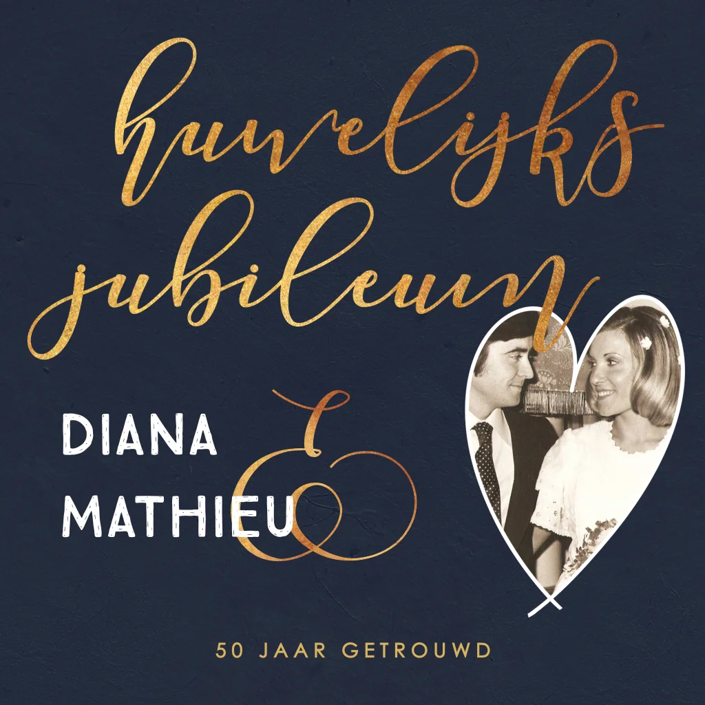 Prachtige huwelijksverjaardag uitnodiging met ruimte voor een persoonlijke foto. Mooi geïllustreerd me gouden letters. Deze kaart past heel mooi bij onze gouden kleur envelop.