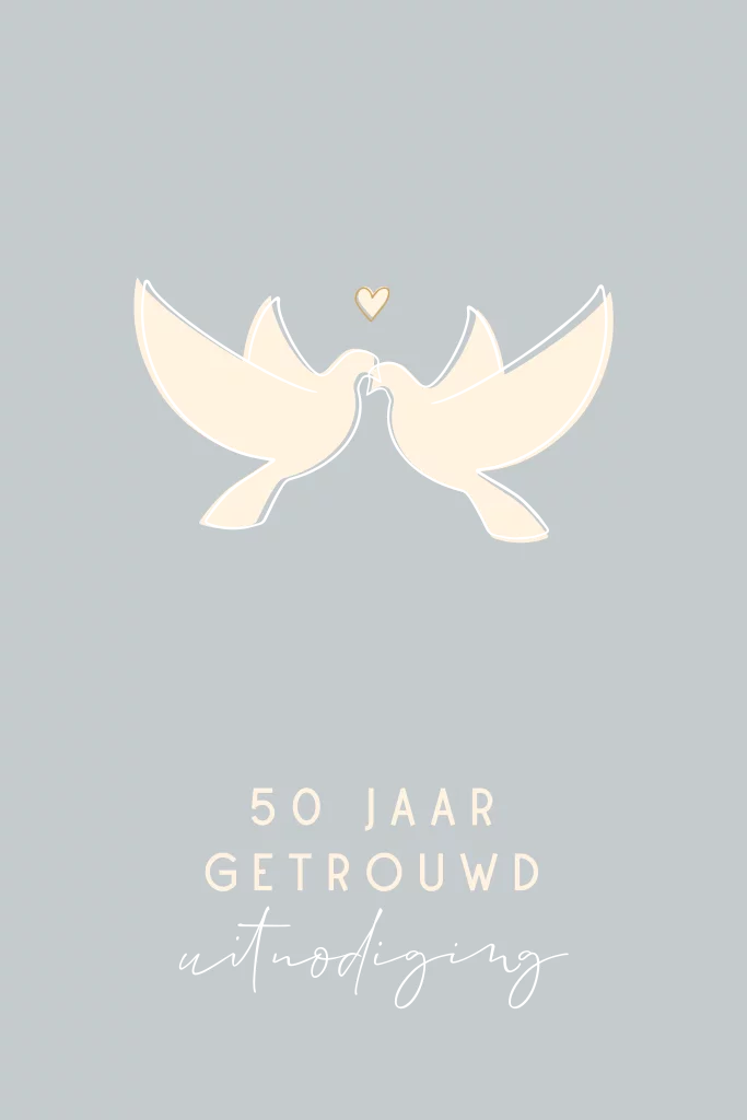 Vier 50 jaar liefde en toewijding met onze prachtige jubileumuitnodiging. Geïllustreerde duiven symboliseren vrede en eeuwige liefde. Personaliseer nu voor een onvergetelijk jubileumfeest!