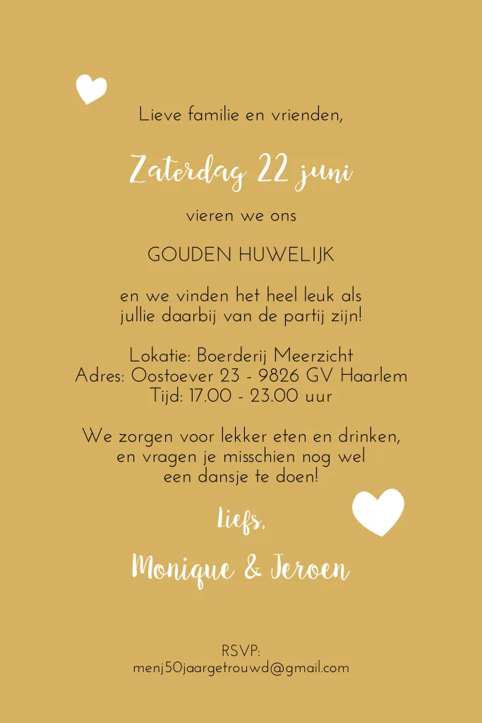 Een gouden hart als uitnodiging voor jullie 50 jarig huwelijks jubileum! Een prachtige kaart voor een bijzonder feest!