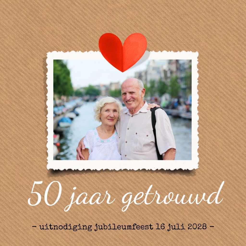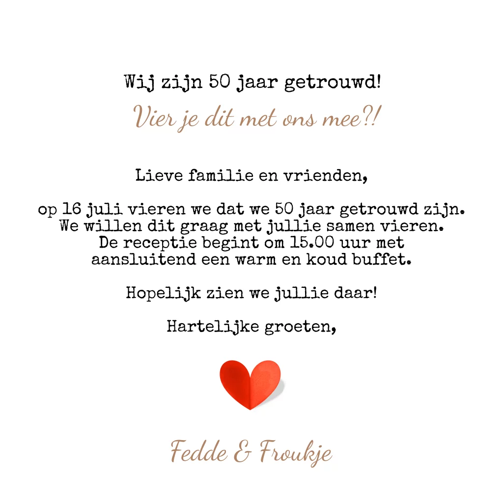 Deze vrolijke kaart met rood hartjes maakt het mogelijk eigen tekst te te voegen aan de uitnodiging van jullie 50-jarige huwelijksfeest.
