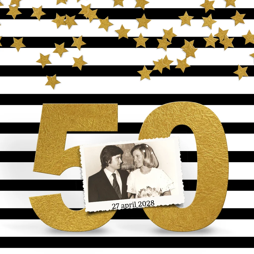 Deze strepen en goud kaart is persoonlijk te maken door eigen tekst toe te voegen in de witte vlakken. Geef jullie gasten alvast een speciaal gevoel met deze unieke kaarten persoonlijke foto van jullie samen! Gaaf met een bijpassende envelop.