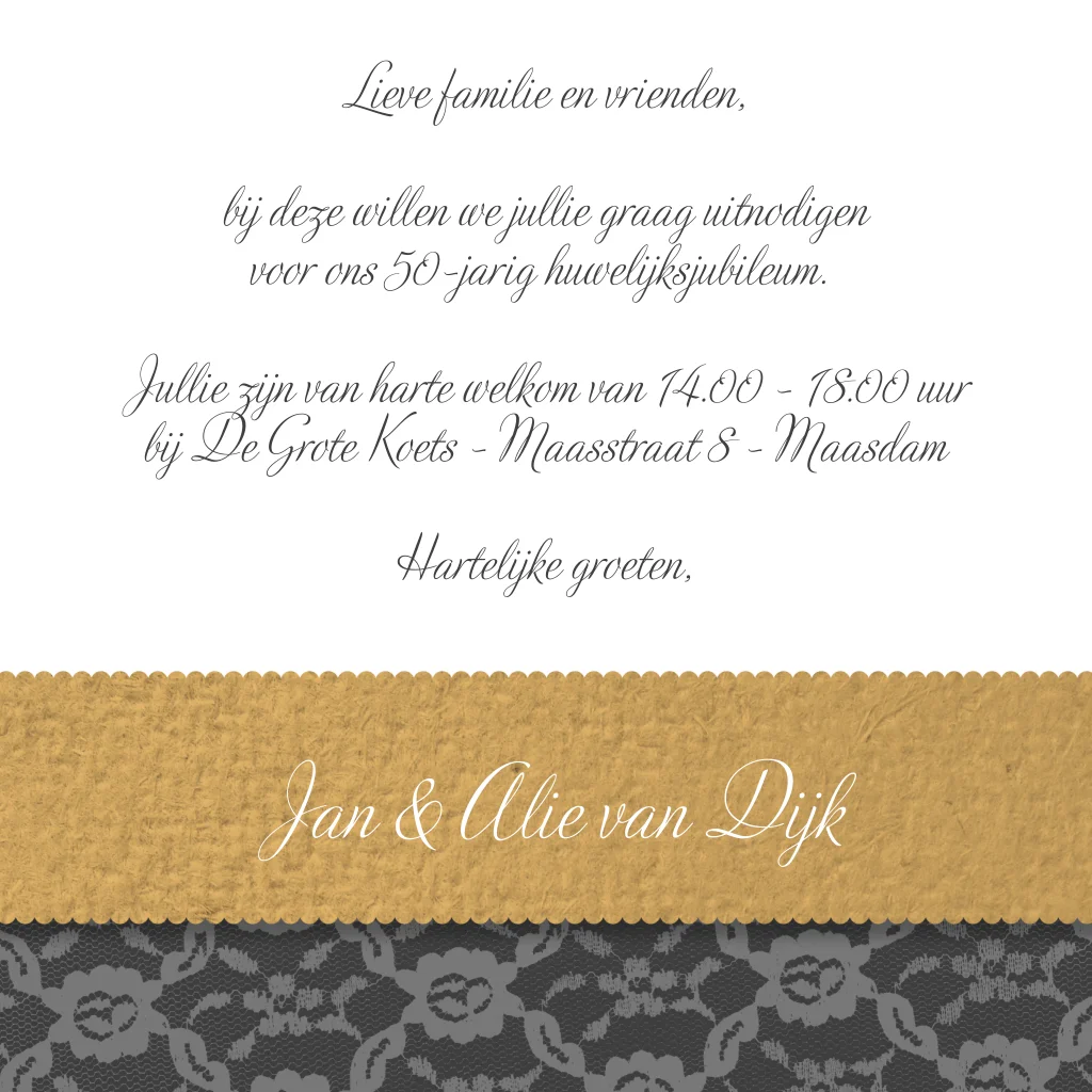 Zijn jullie binnenkort 50 jaar getrouwd? Met deze barok kaart met gouden randje kun je iedereen een unieke uitnodiging sturen voor jullie gouden bruiloft. Kies er een mooie gouden envelop bij!