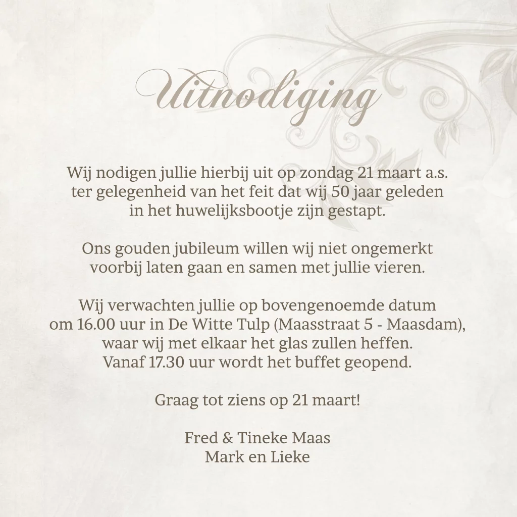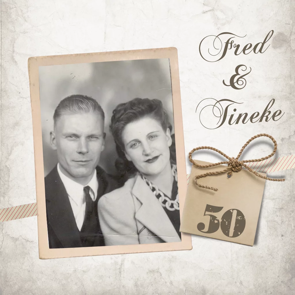 Bent u binnenkort 50 jaar getrouwd? Gebruik dan deze kaart in mooie landelijke kleuren om uw gasten uit te nodigen voor het feest. De tekst, het jaartal en de foto past u makkelijk zelf aan.