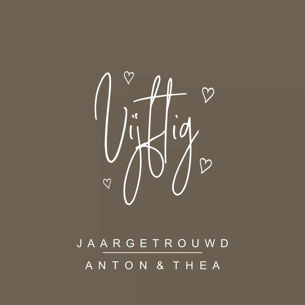 Ontdek deze schitterende uitnodiging voor een 50-jarig huwelijksjubileum: een prachtige donkerbruine kaart met echt goudfolie. Deze unieke uitnodiging is volledig aanpasbaar naar wens uiteraard ook de kleur. Bewerk alle elementen naar eigen smaak en maak er een persoonlijk meesterwerk van.
