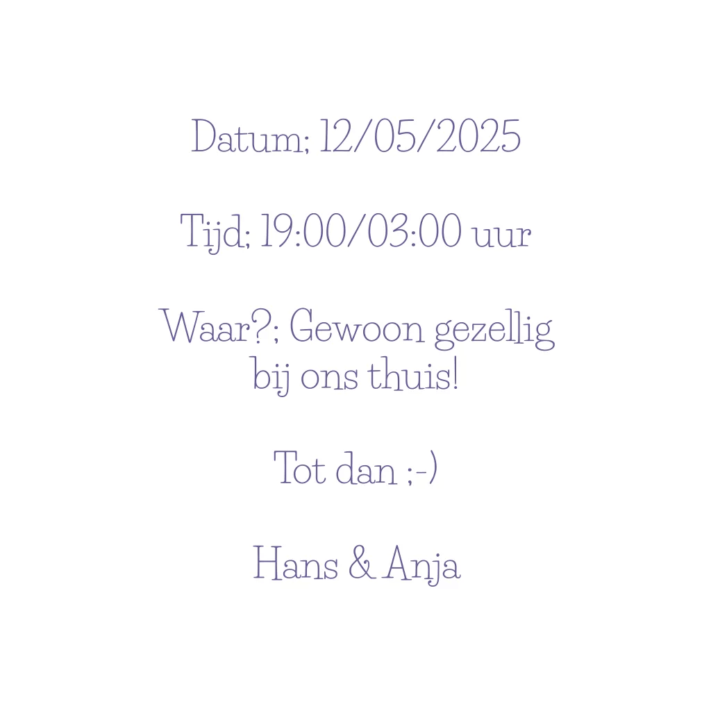 Een vrolijke uitnodiging voor een 50 jarig huwelijksjubileum. Met deze kaart leg je de nadruk op jullie leven met foto's. Dat maakt deze kaart heel persoonlijk. De foto's zijn gemakkelijk te vervangen. Maak het af met een bijpassende envelop en sluitzegel.