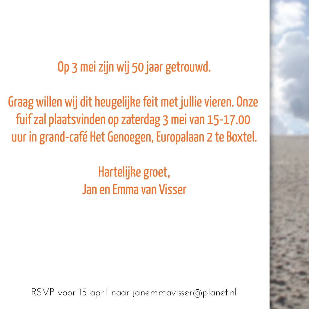 Jubileumkaart voor 50-jarig huwelijk. Pas de tekst aan en bestel daarna een echte proefdruk voor €0,99 (exclusief verzendkosten).