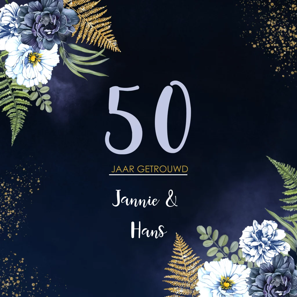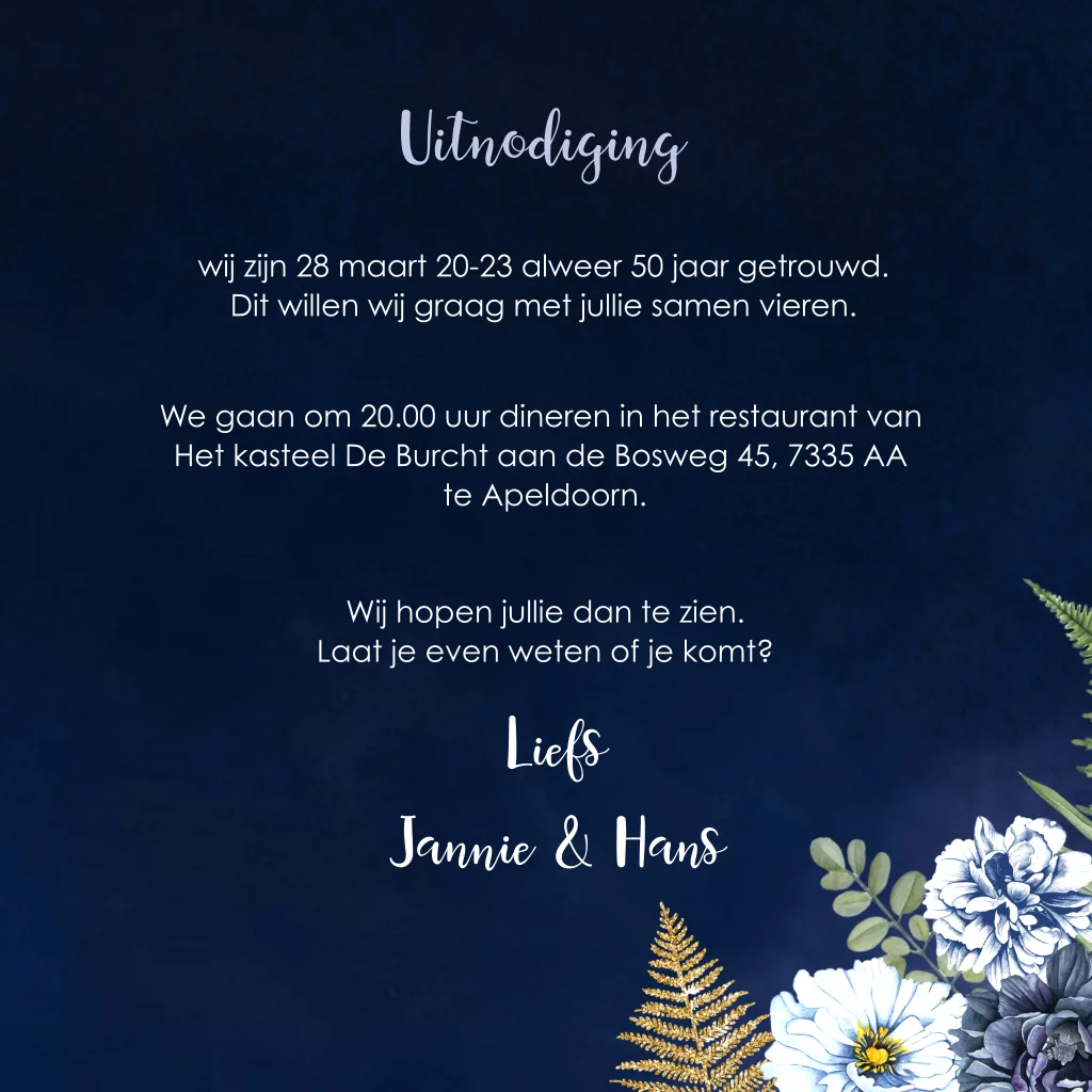 Uitnodiging 50 jaar getrouwd met sfeervolle blauwe en witte rozen versierd met goudlook elementen. Dat past perfect bij een gouden huwelijksjubileum. Maak het af met een mooie envelop en sluitzegel.