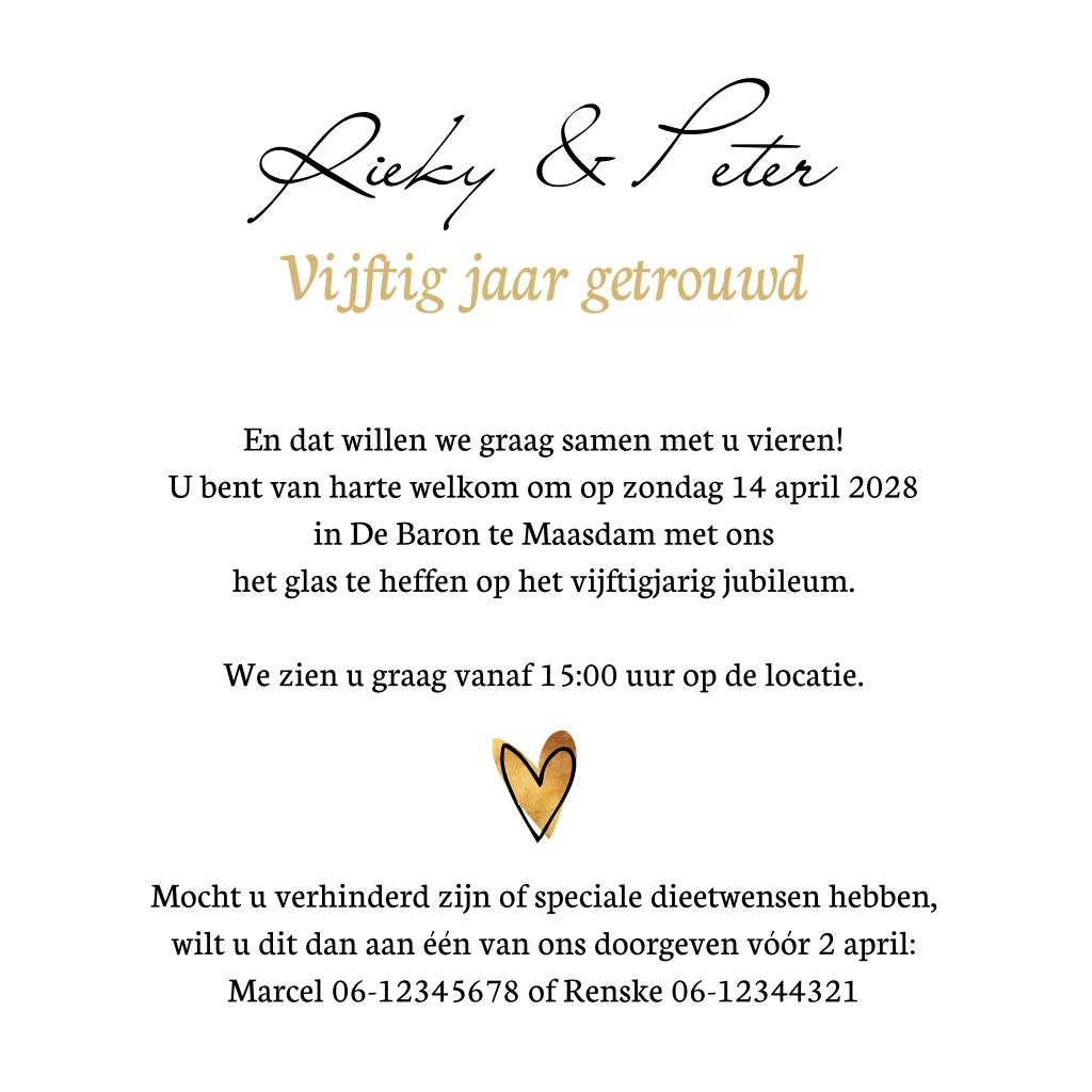 Romantische uitnodiging voor jullie 50 jaar getrouwd feest. Liefdevolle tekst op kraft achtergrond met toevoeging van gouden hartjes. En persoonlijk door de foto van jullie samen aan de binnenkant van de kaart. Maak het compleet met een gouden envelop.