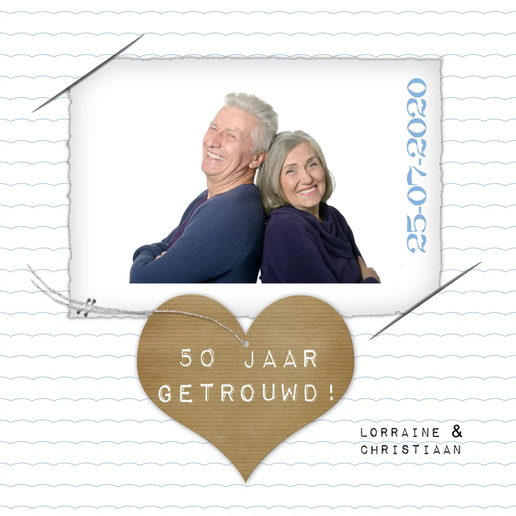 Eenvoudig jubileumkaartje waar je een mooie foto kan toevoegen. Leuk door het kraft hartje en strepen patroon.