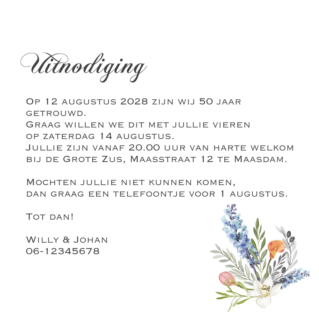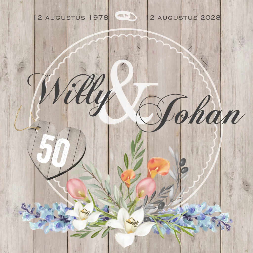 Uitnodiging vijftig jaar getrouwd met bloemen op hout