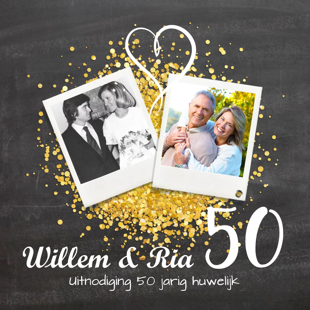 Feestelijke maar liefdevolle kaart voor jullie vijftig jarig huwelijksfeest. Vrolijk door de gouden confetti en persoonlijk door de foto's. Maak het af door te kiezen voor een gouden envelop.