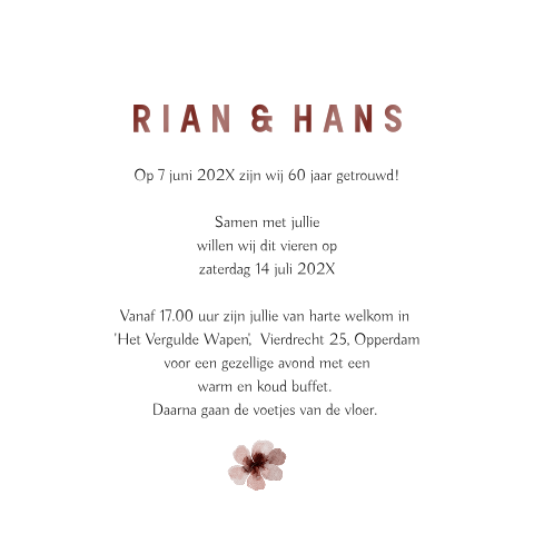 het is zover! [Datum] zijn we 60 jaar getrouwd. Deze feestelijke gebeurtenis willen we graag met onze familie en vrienden vieren, op [datum] te [locatie]. We hopen dat u hierbij aanwezig kunt zijn! Het feest begint om [tijdstip] en het adres van de locatie is [adres]. We hopen u [datum] te zien.
