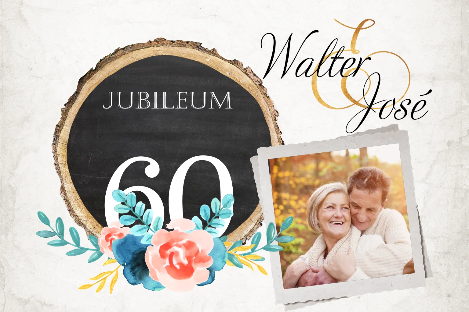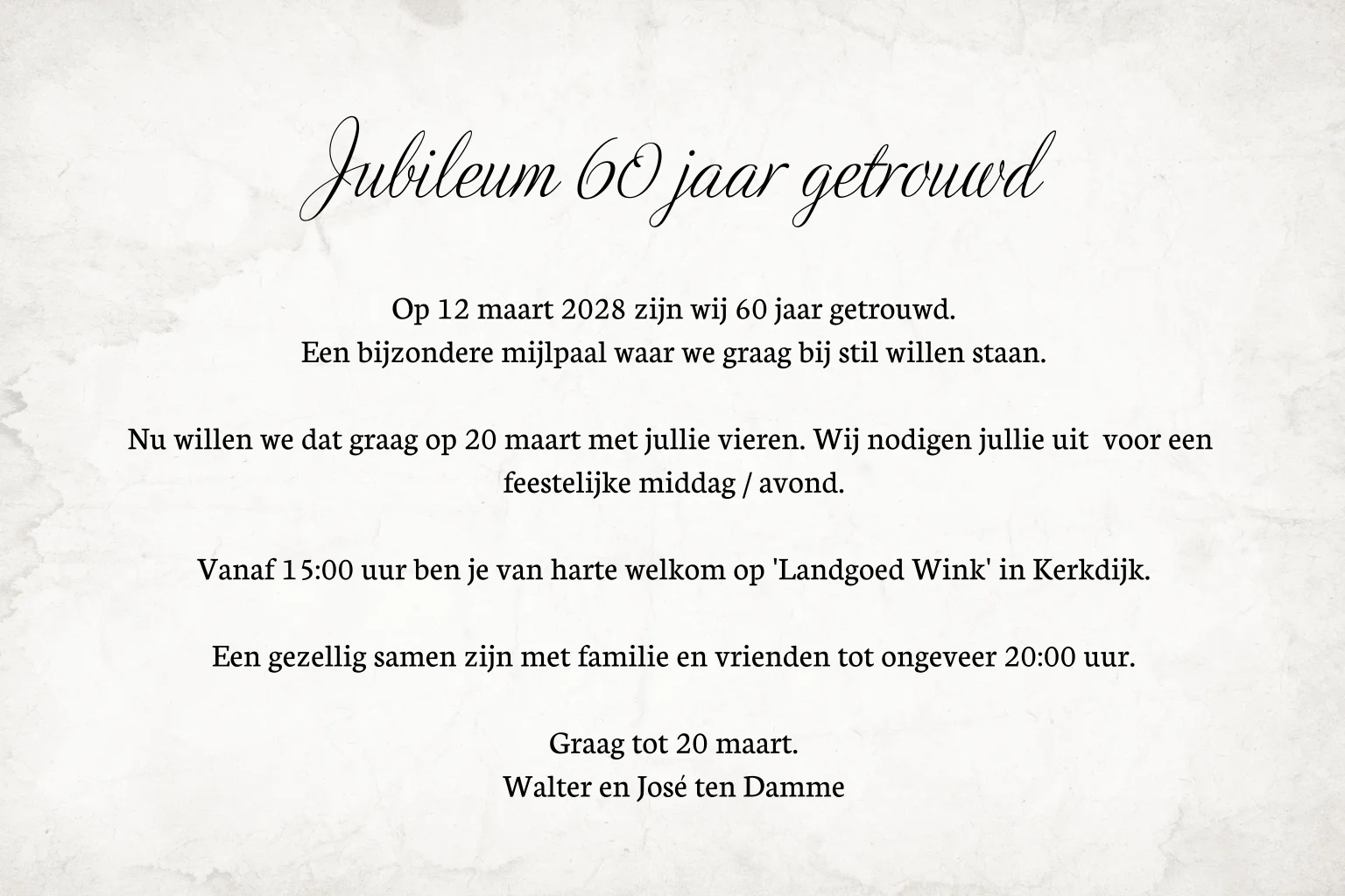 Stijlvolle uitnodiging voor jullie 60 jarig huwelijksjubileum. Extra persoonlijk door de foto van jullie. De sierlijke elementen op het hout maken de kaart helemaal af. Mooi met een peach kleur envelop.