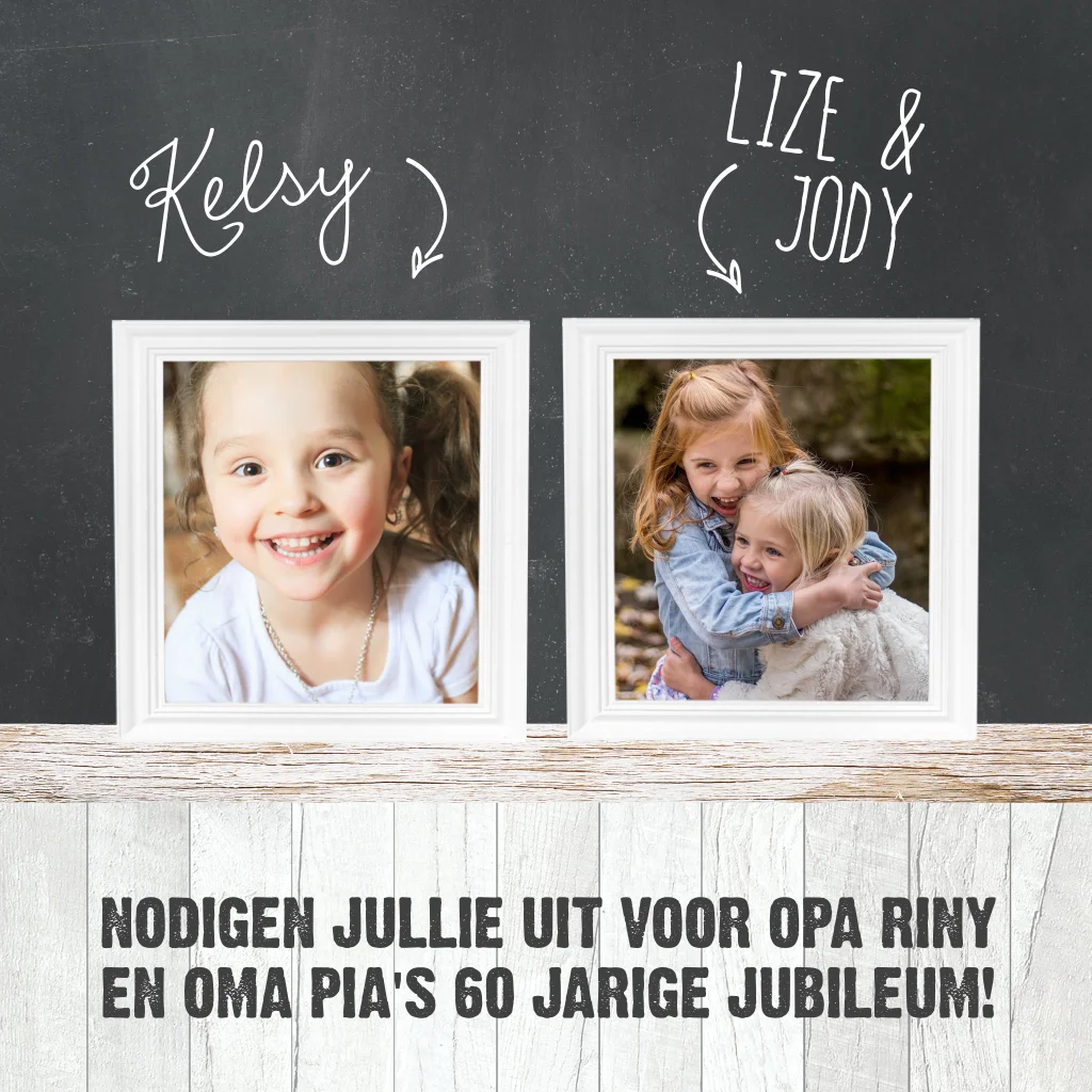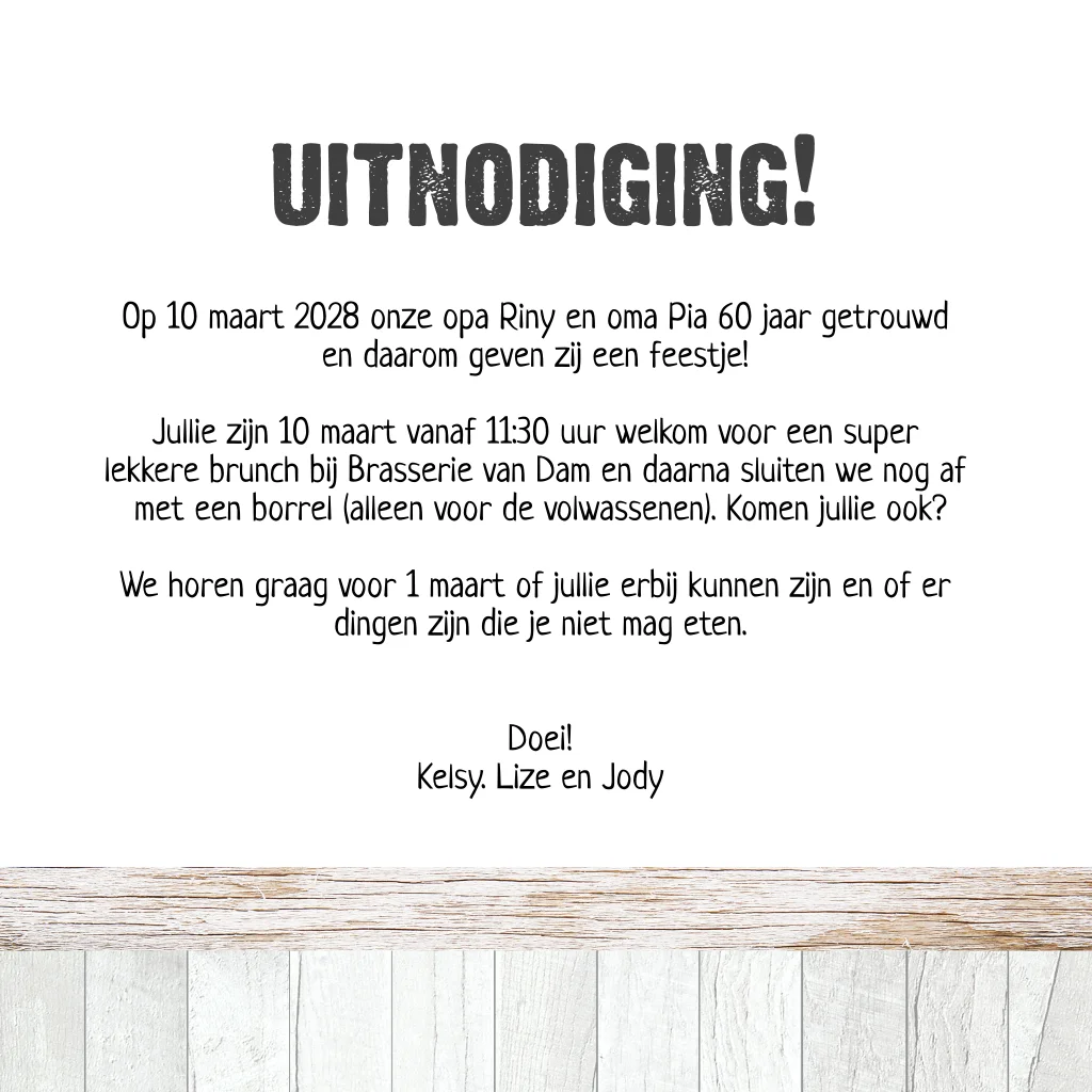 Een liefdevolle uitnodiging voor jullie 60 jarig huwelijksjubileum. Erg persoonlijk door de toevoeging van foto's van de kleinkinderen. Mooi ook met de hout elementen.