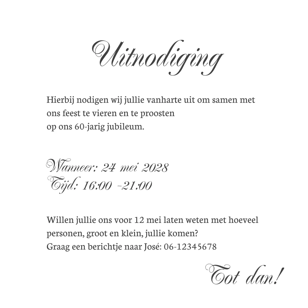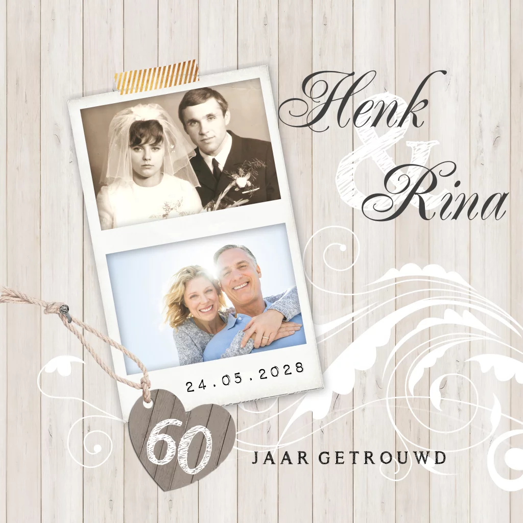 Feestelijke stijlvolle uitnodiging voor jullie 60 jarig huwelijksjubileum. Extra persoonlijk door de 2 foto's van jullie toen en nu. De sierlijke elementen op het hout maken de kaart helemaal af. Proost op jullie zestig mijlpaal.