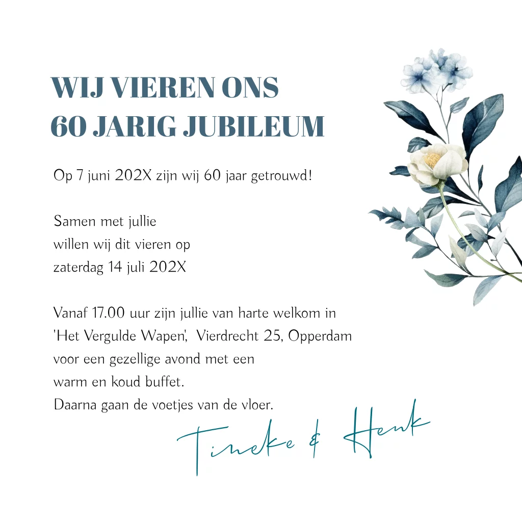 Vier 60 jaar samenzijn met deze prachtige jubileumuitnodiging Romantic Botanic Blue. Voeg eenvoudig een persoonlijke touch toe met jullie eigen foto's.