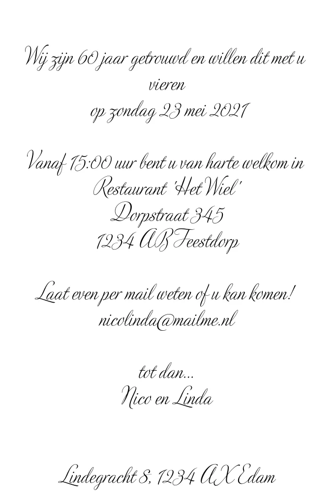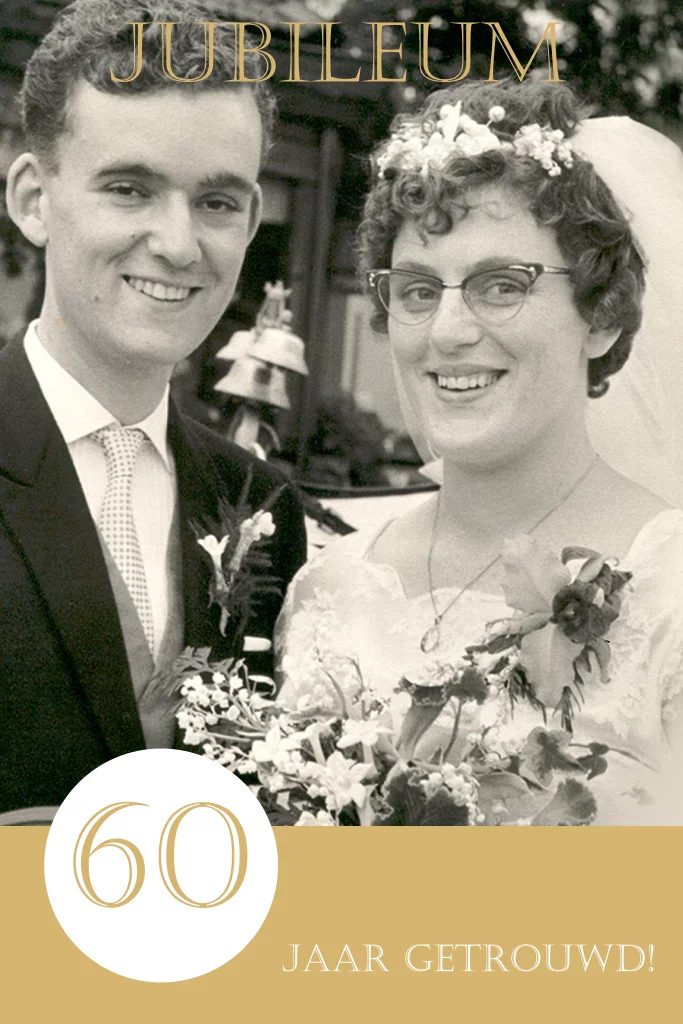 Staande jubileumkaart waarop je jullie mooiste trouwfoto kunt plaatsen. Vier jullie diamanten huwelijk met de mensen die jullie dierbaar zijn. De kleuren van deze kaart komen goed tot zijn recht op parelmoer- en fotopapier. Bestel een proefdruk voor €0,99.