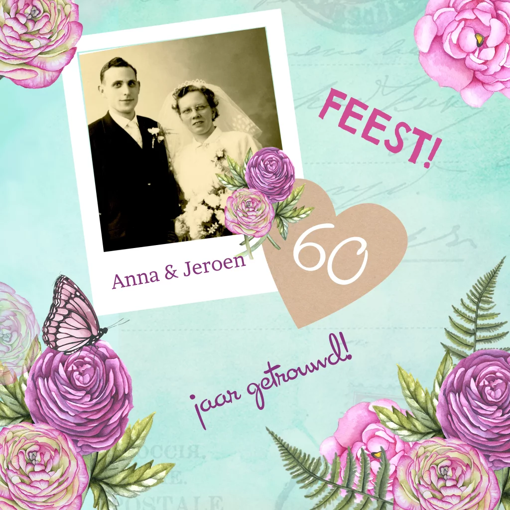 Uitnodiging huwelijksjubileum met mooie bloemen in aquarel versierd met een hartje. Voeg een mooie foto toe om het af te maken.