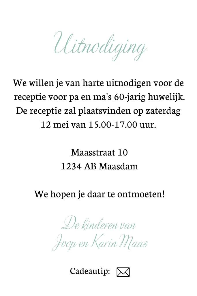 Mooie klassieke uitnodiging voor een 60 jarig huwelijksjubileum. Door de mintgroene rand is deze kaart goed te combineren met een mintgroene envelop. Ook aan de binnenkant is er nog ruimte voor een persoonlijke foto.