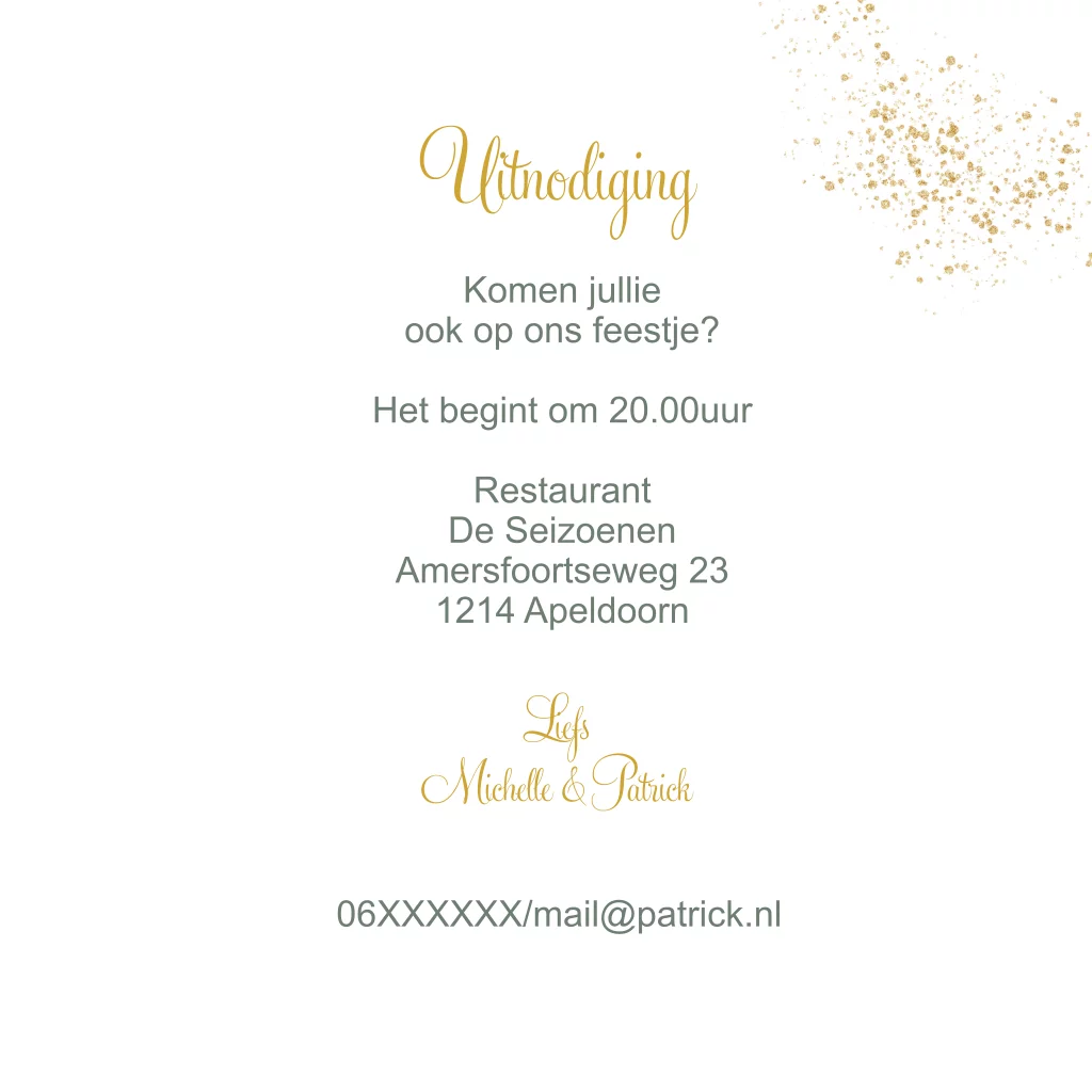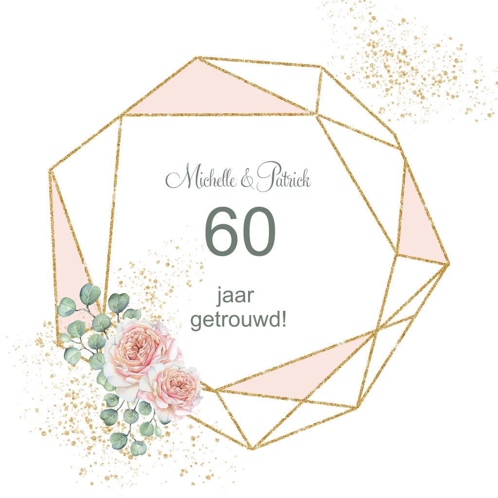 Uitnodiging voor een zestig jarig huwelijk met mooie botanische rozen in een mooi goudkleurig frame. Alle teksten zijn gemakkelijk zelf aan te passen. Deze kaart past mooi bij een oud roze of gouden envelop.