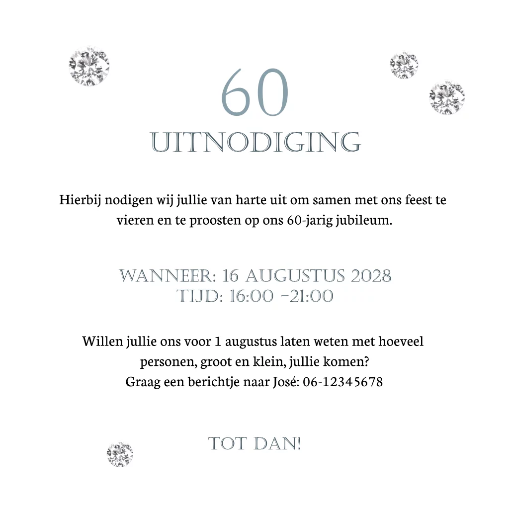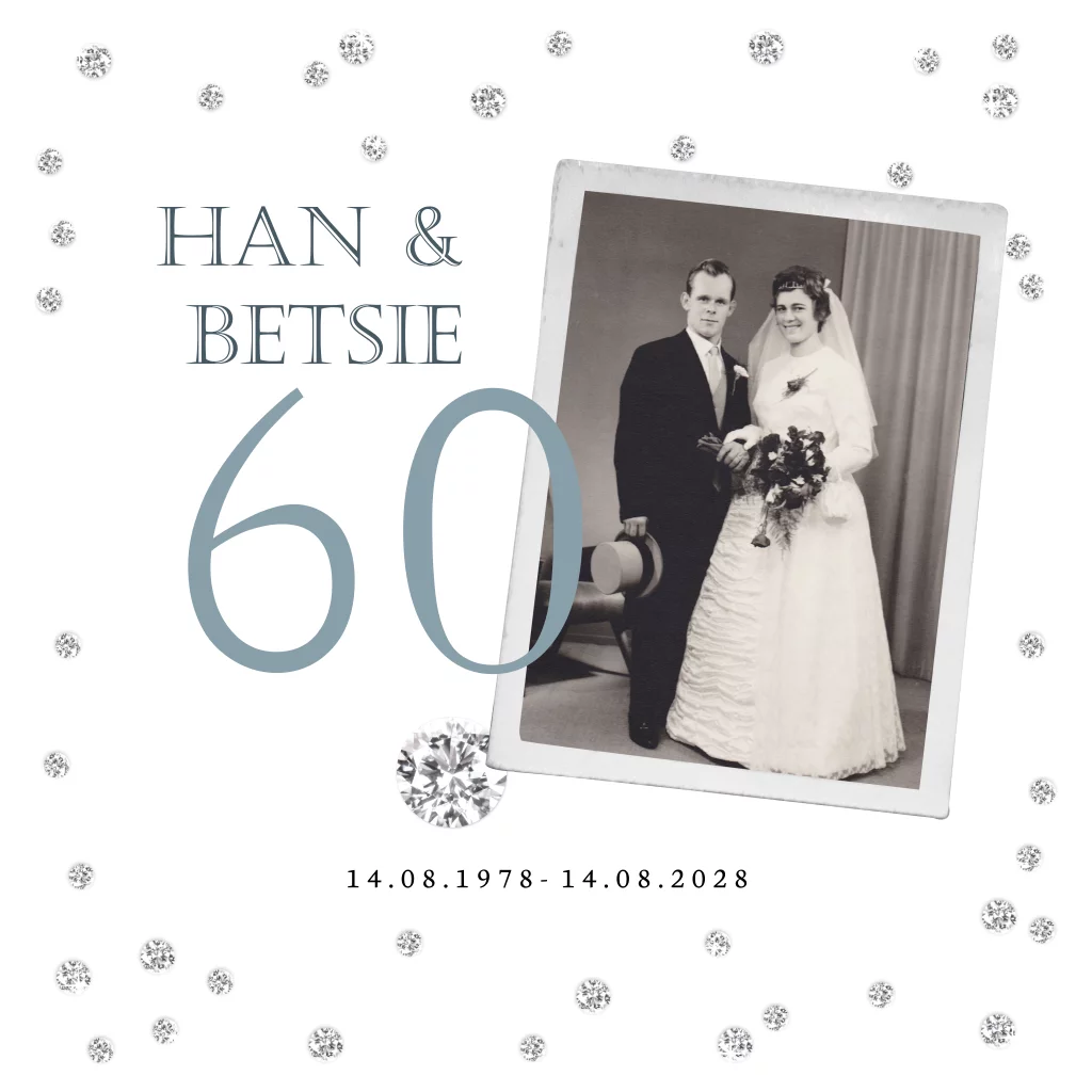 Deze prachtige feestelijke uitnodiging past perfect bij jullie 60 jarig huwelijksjubileum. De kaart is mooi versierd met confetti van diamantjes. Mooi met een persoonlijke foto van jullie samen. Maak het af met een zilveren of lichtgrijze envelop.