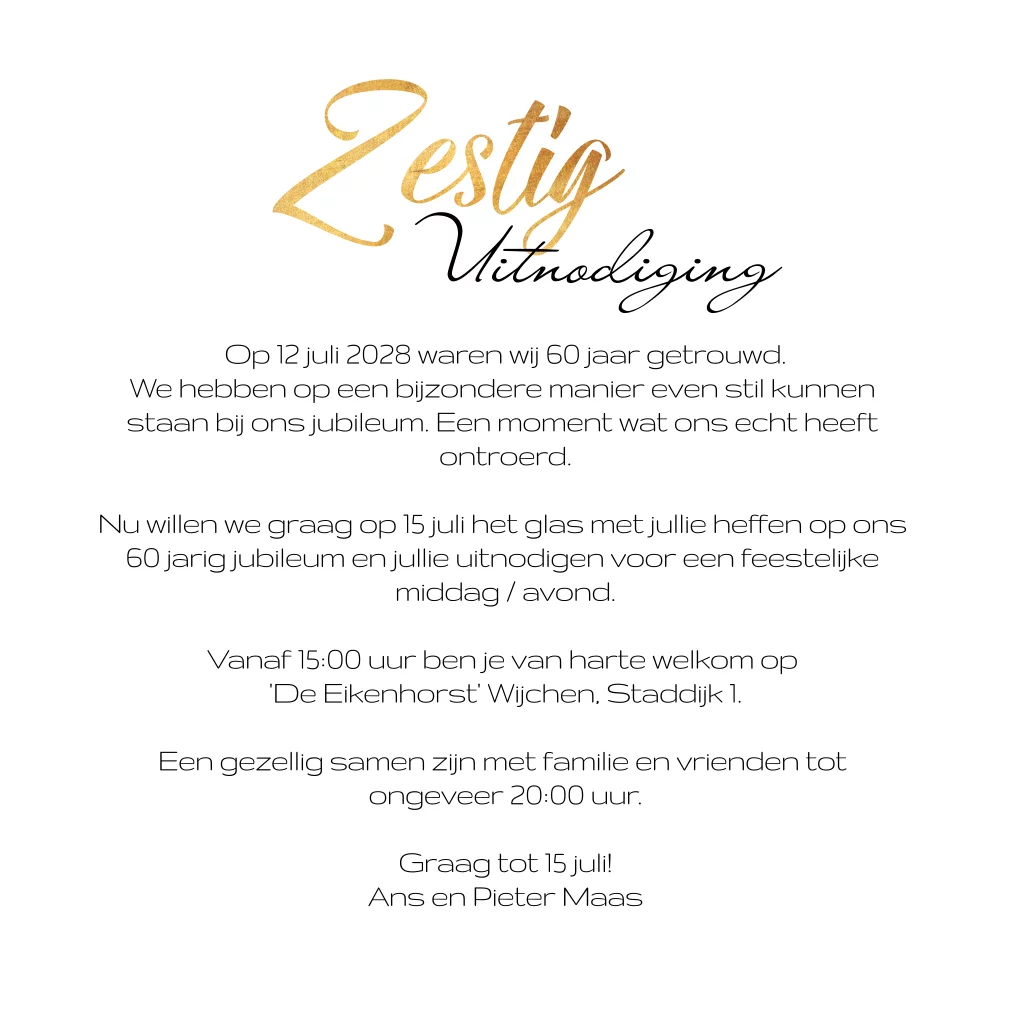 Uitnodiging 60 jaar getrouwd met foto en goudlook zestig