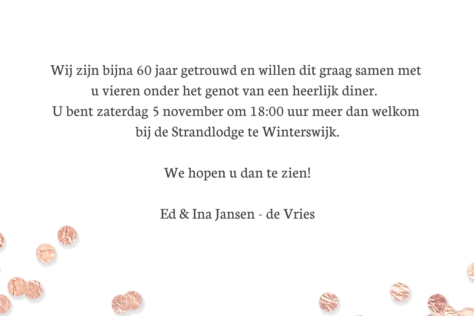 Feestelijke en romantische uitnodiging voor jullie 60 jarig jubileum. Mooie rosé gouden vrolijke confetti. De kaart krijgt een persoonlijk tintje door de toevoeging van de foto van jullie samen.