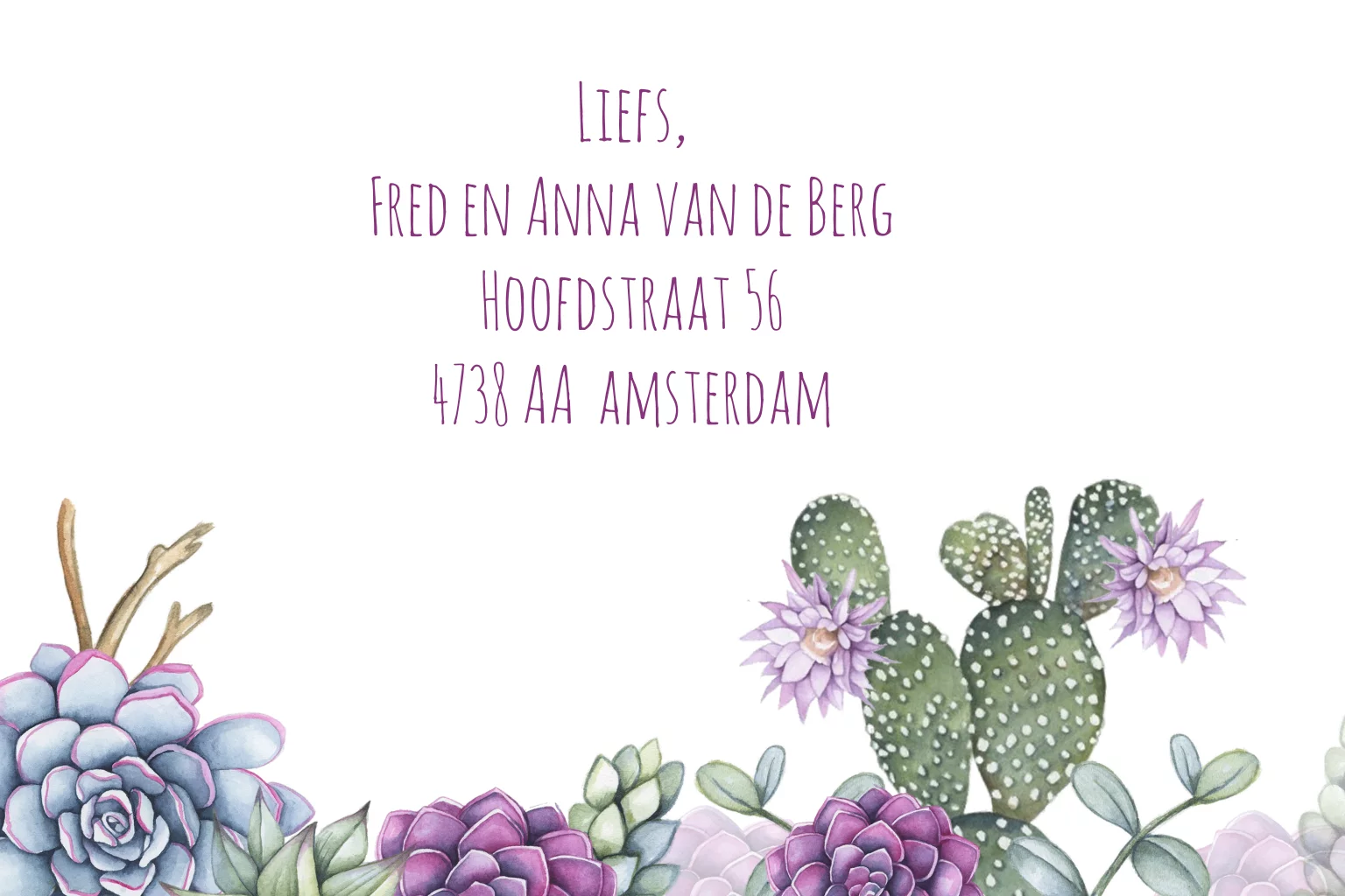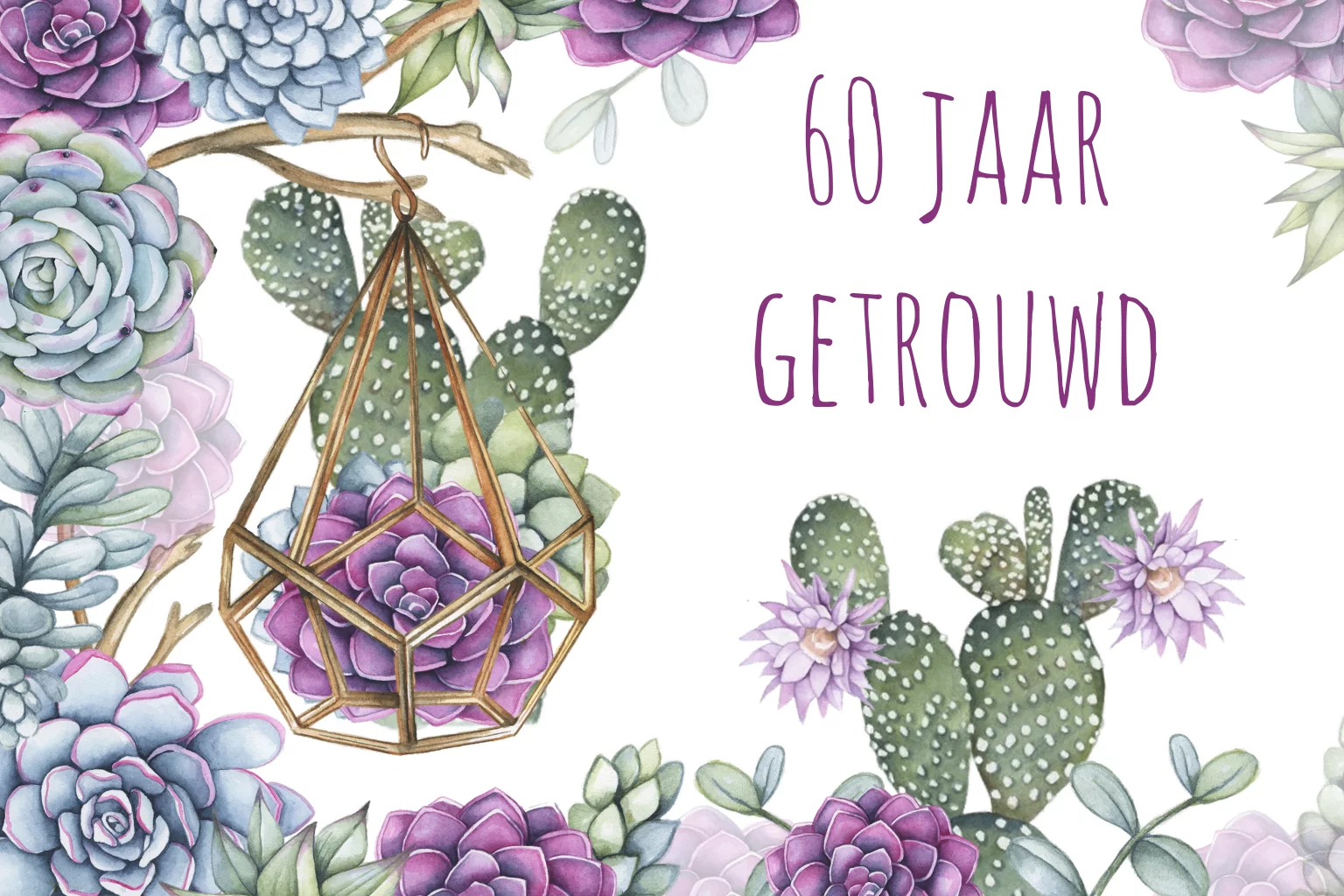 Uitnodiging voor een huwelijksjubileum met vetplanten en cactus. Door de vrolijke paarse tinten wordt de uitnodiging een feest om te versturen.