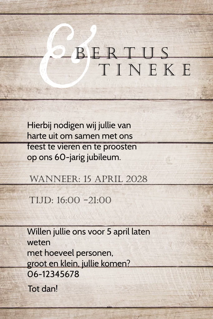 Feestelijke stijlvolle uitnodiging voor jullie 60 jarig huwelijksjubileum. Aan de binnenkant is er ruimte voor een persoonlijke foto. De sierlijke elementen op het hout maken de kaart helemaal af. Maak het af met een bijpassende kleur envelop.